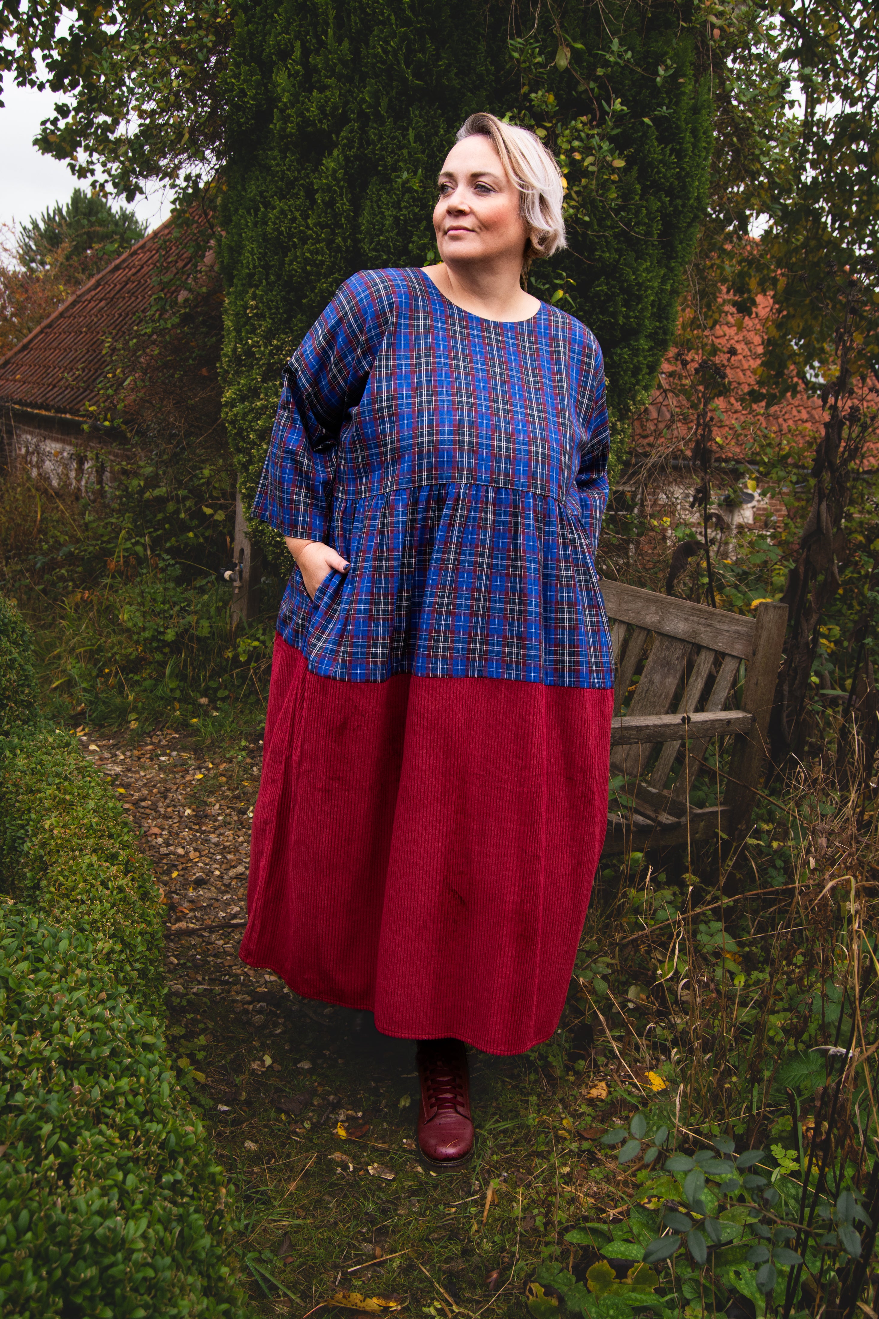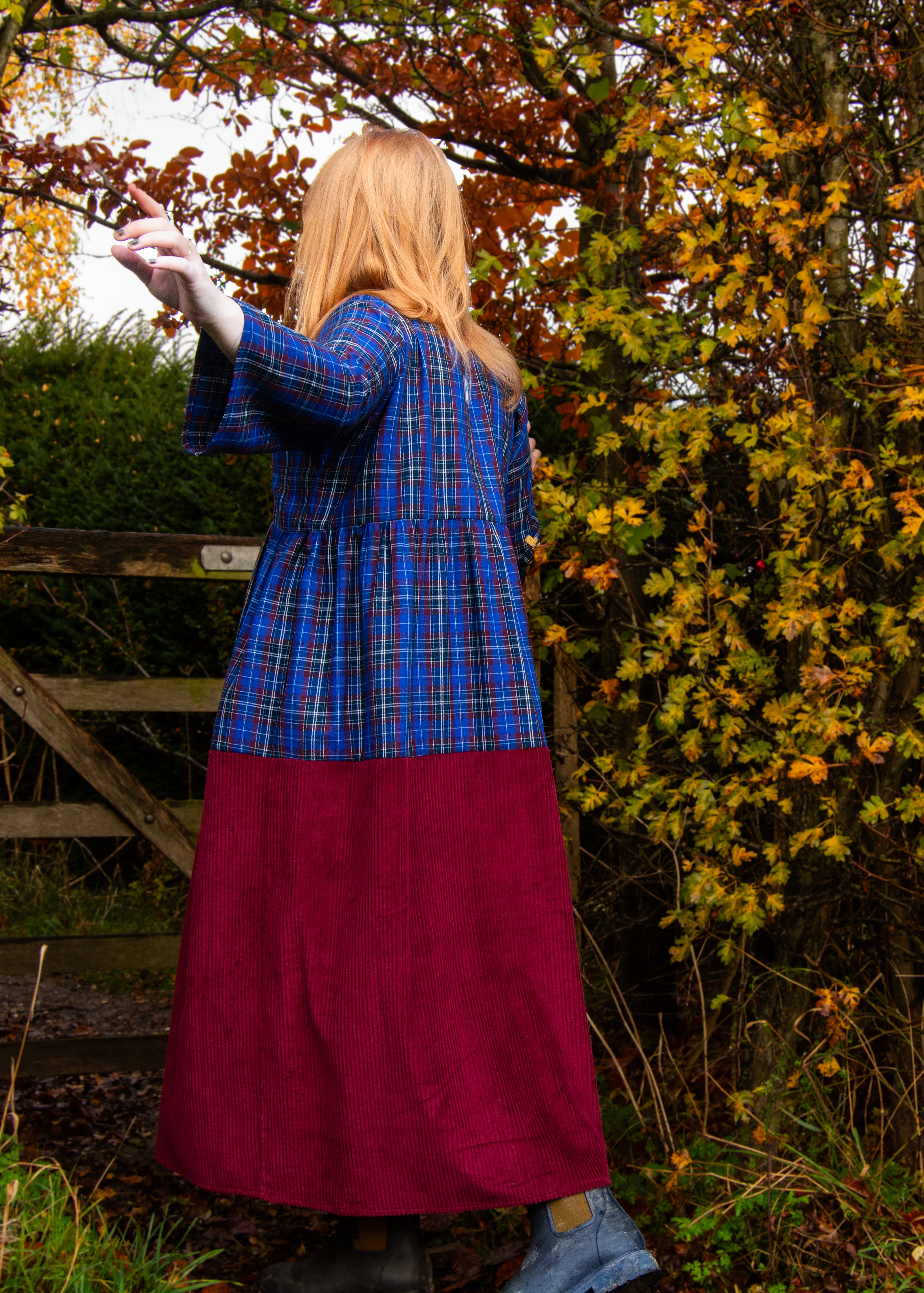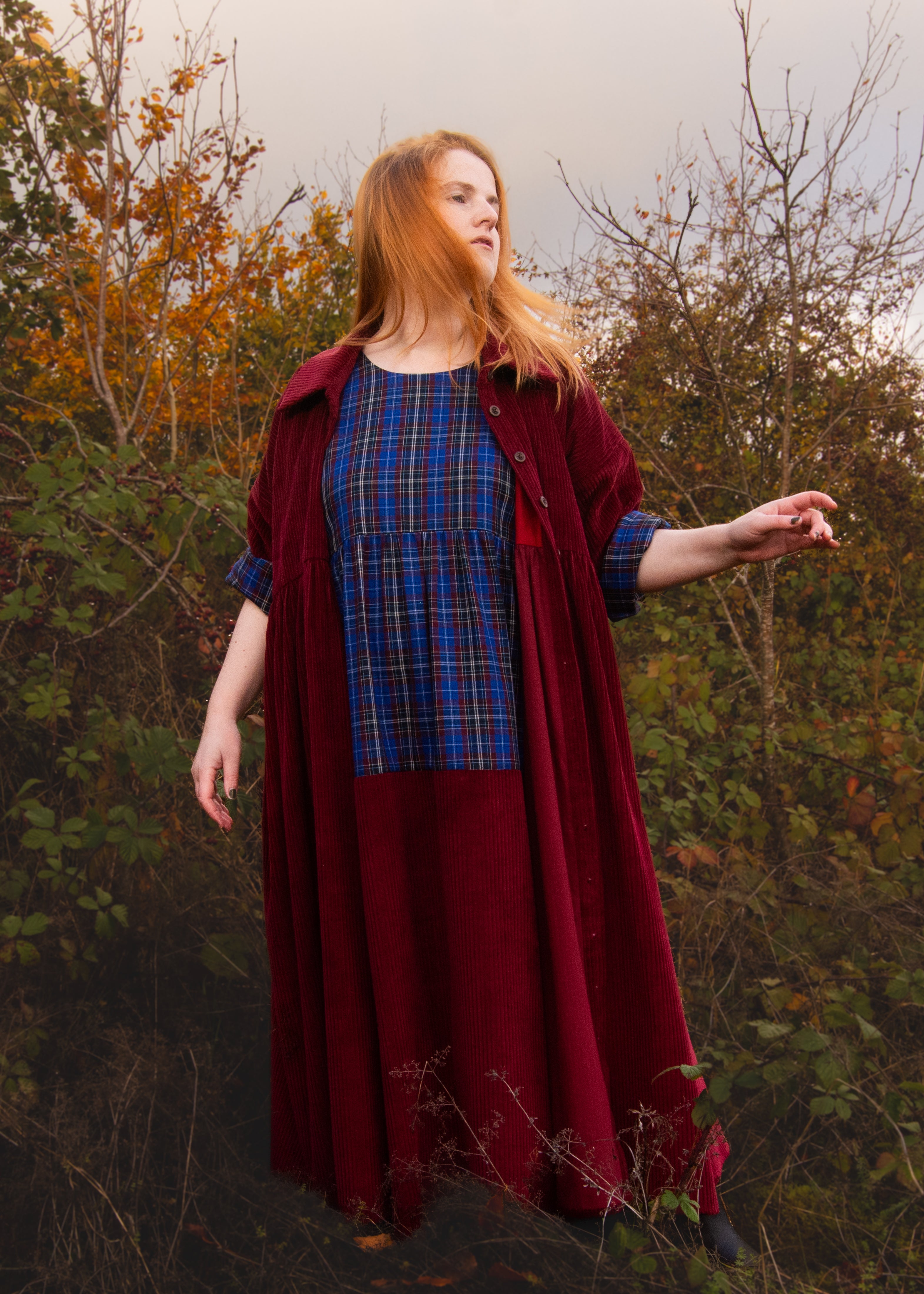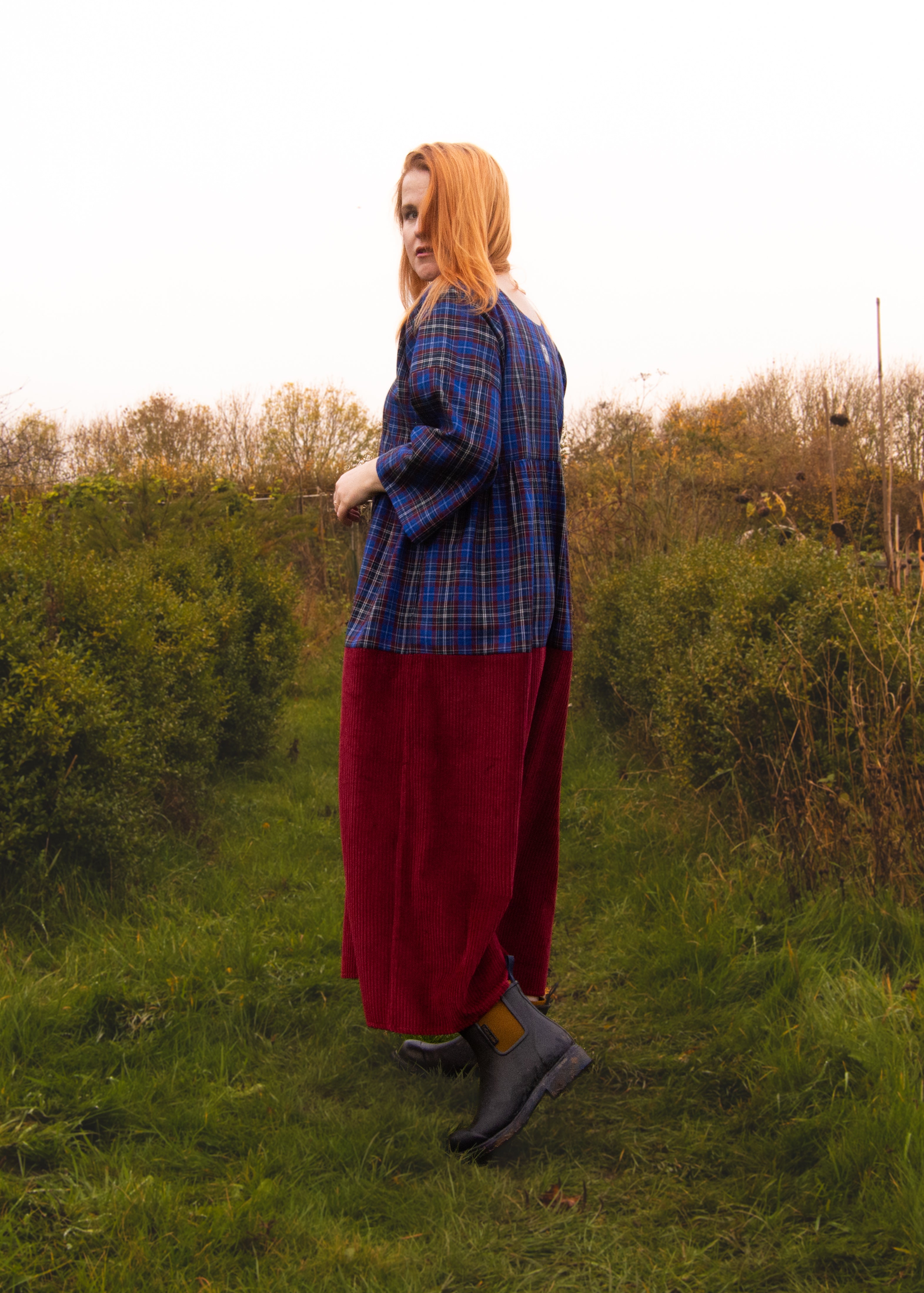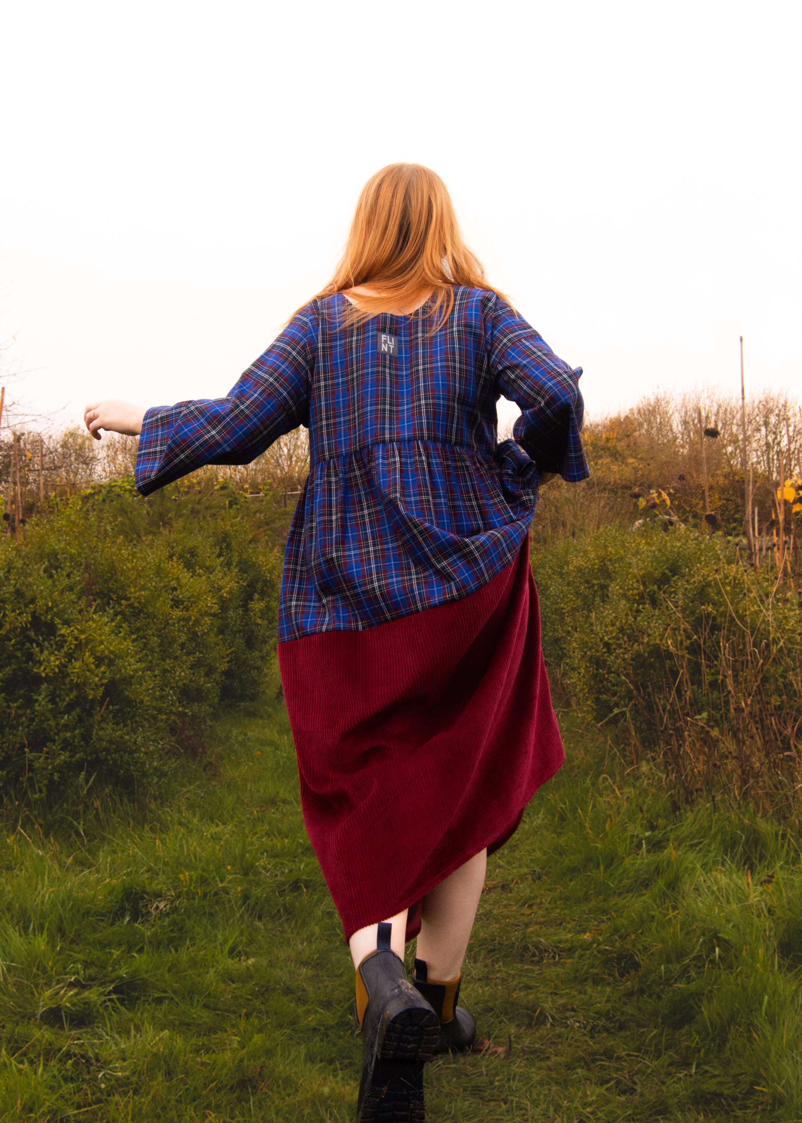 This limited edition version is made in a beautifully soft brushed cotton check — a blend of burgundy and blue tones — with a contrasting wine red corduroy skirt panel that adds texture, warmth, and just the right amount of detail. Cosy, flattering, and unmistakably you.