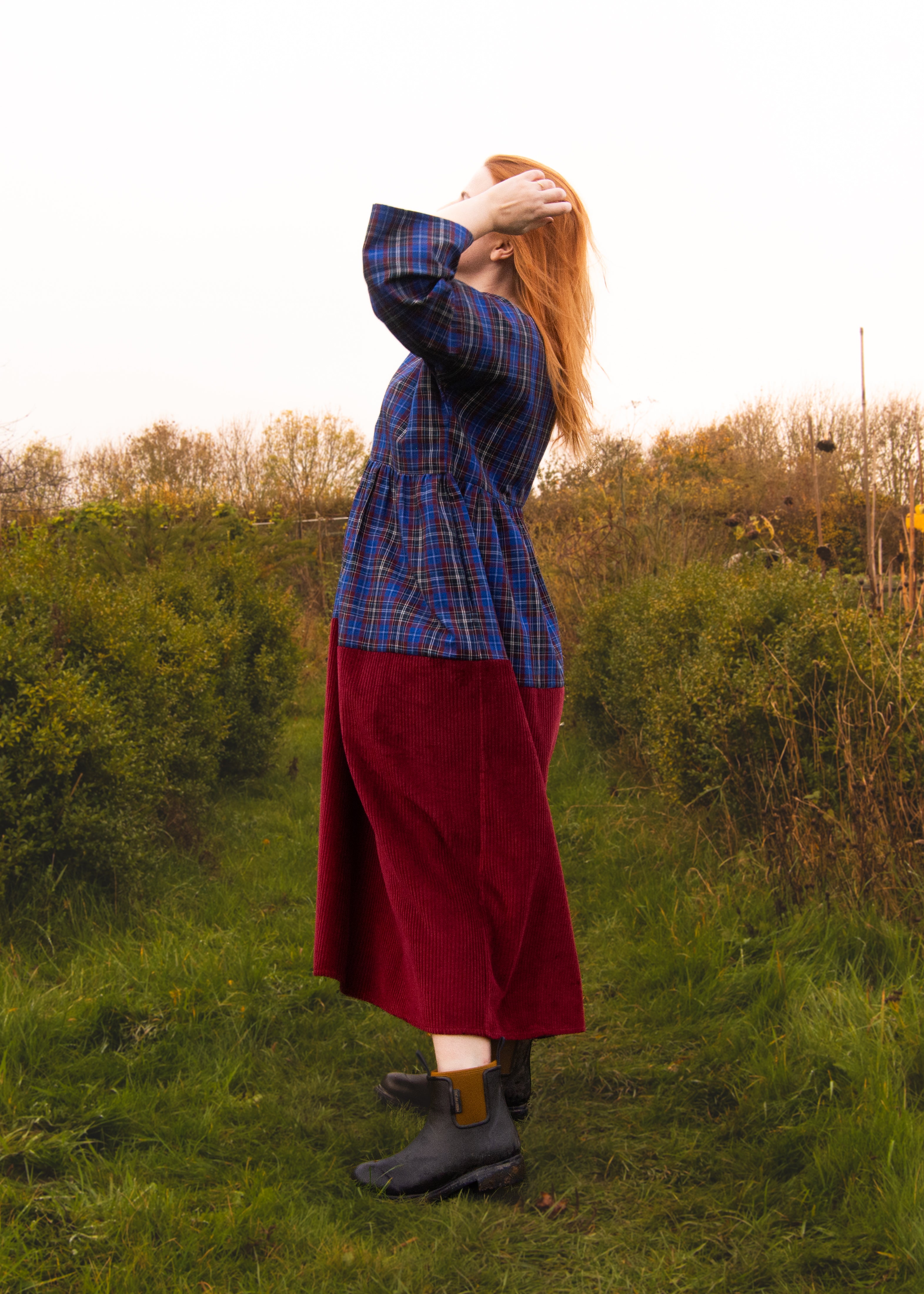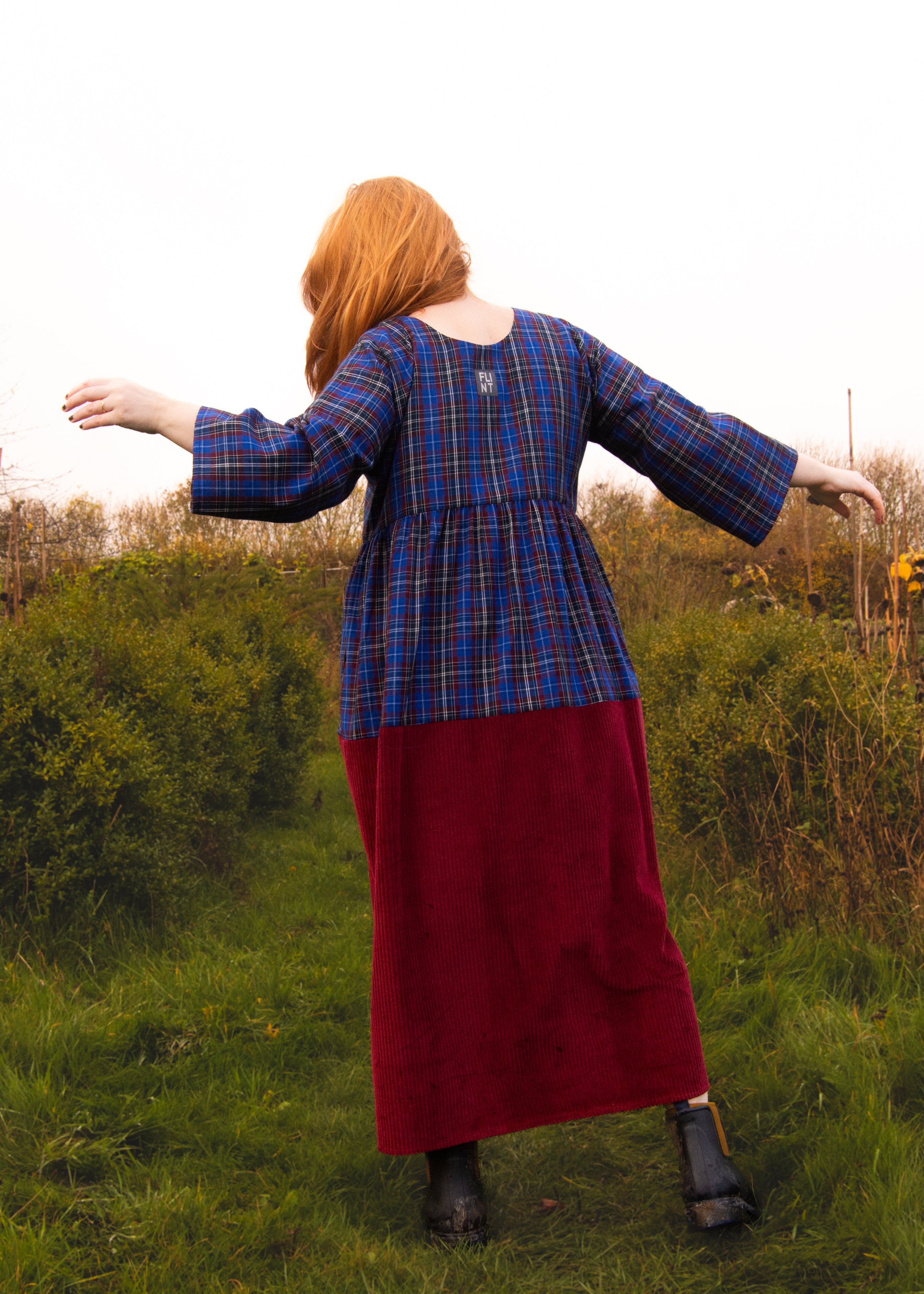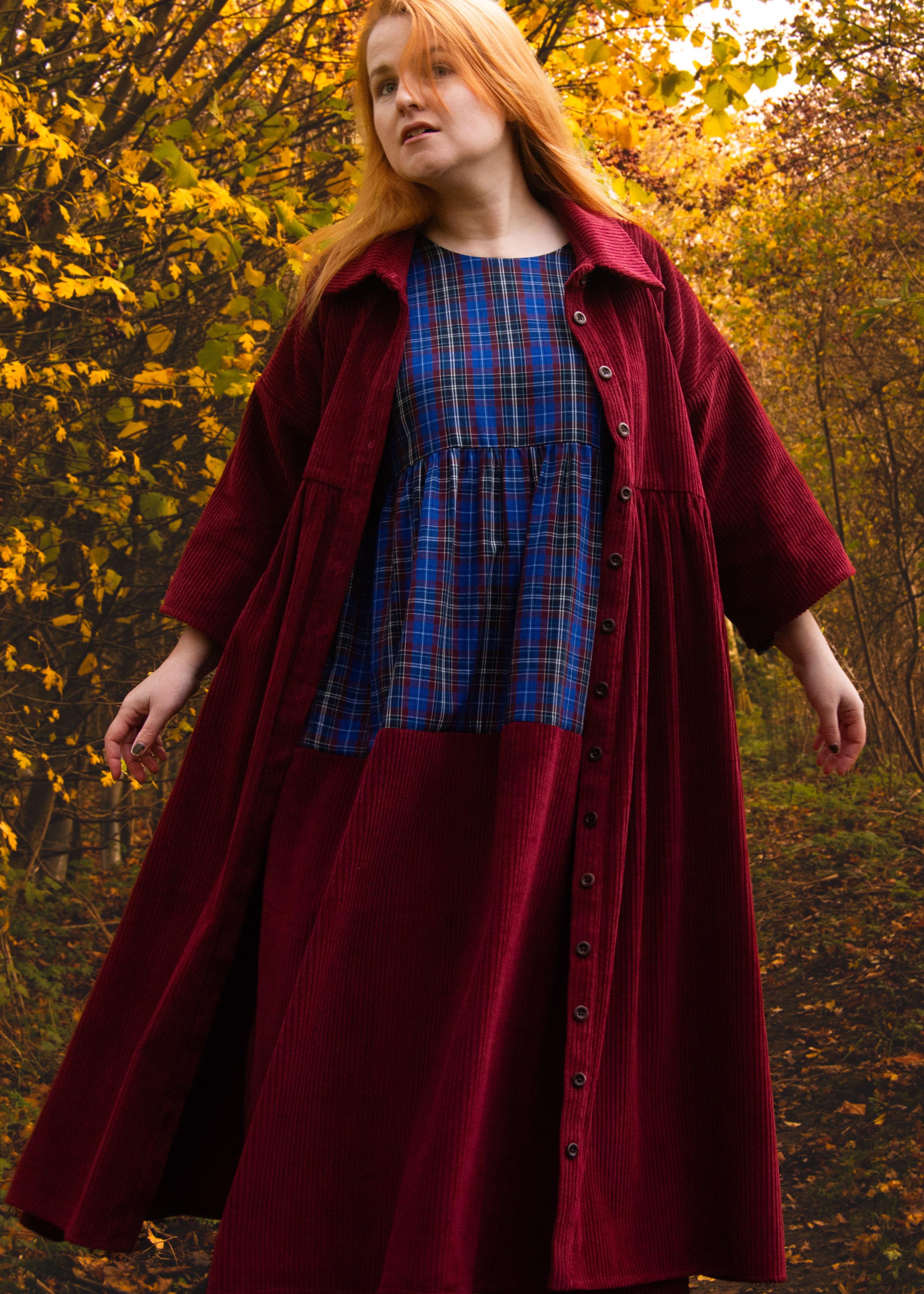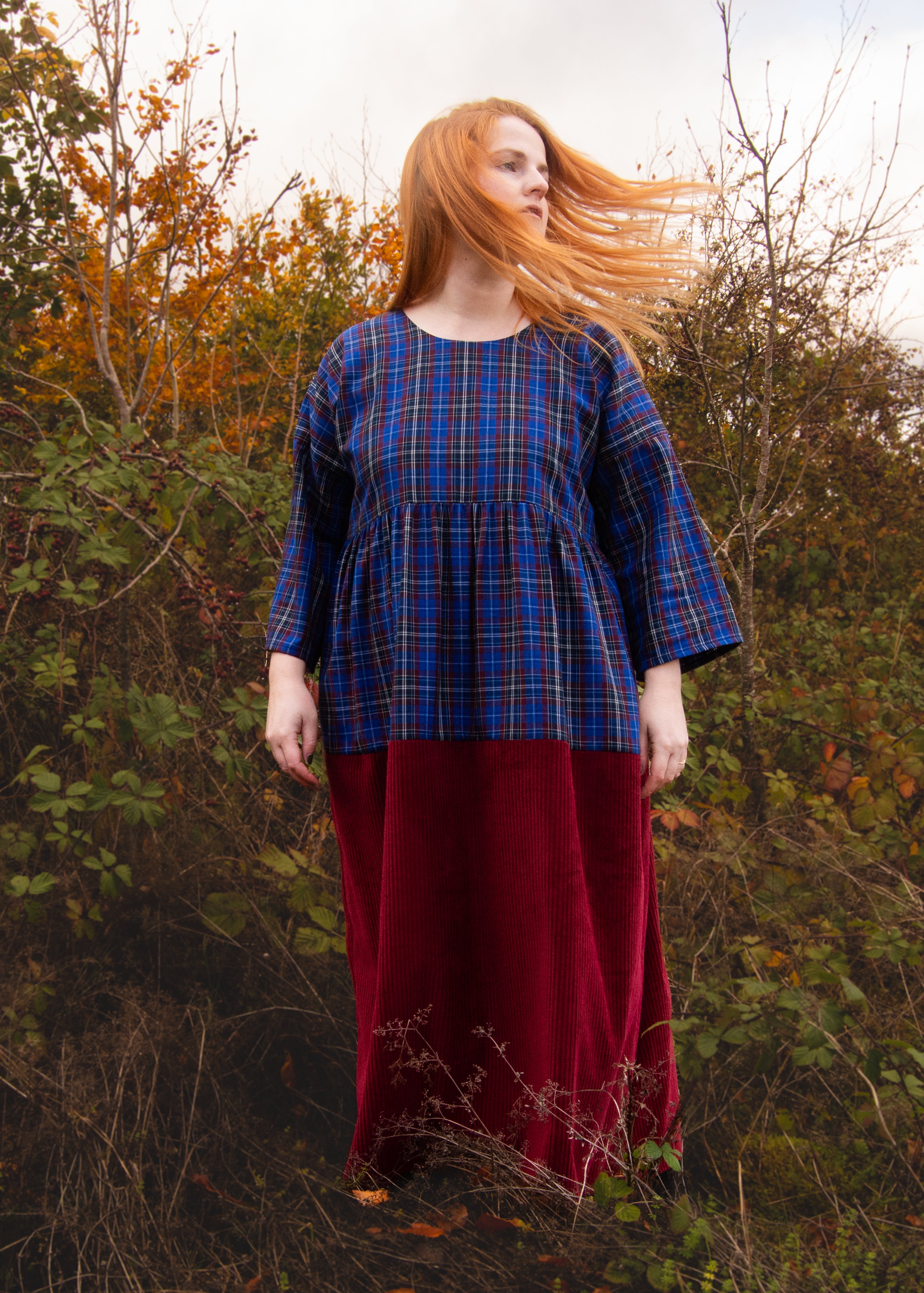 This limited edition version is made in a beautifully soft brushed cotton check — a blend of burgundy and blue tones — with a contrasting wine red corduroy skirt panel that adds texture, warmth, and just the right amount of detail. Cosy, flattering, and unmistakably you.