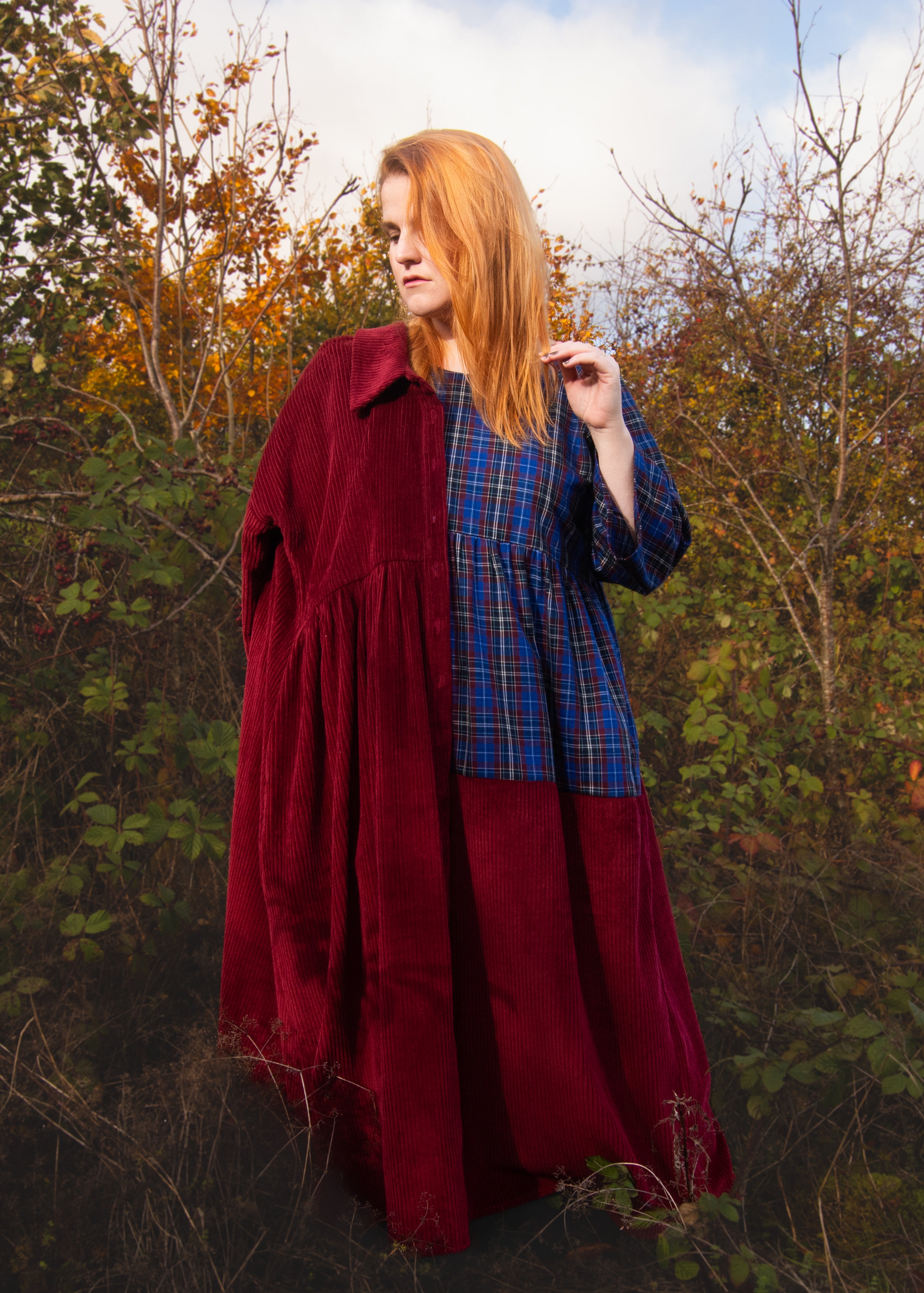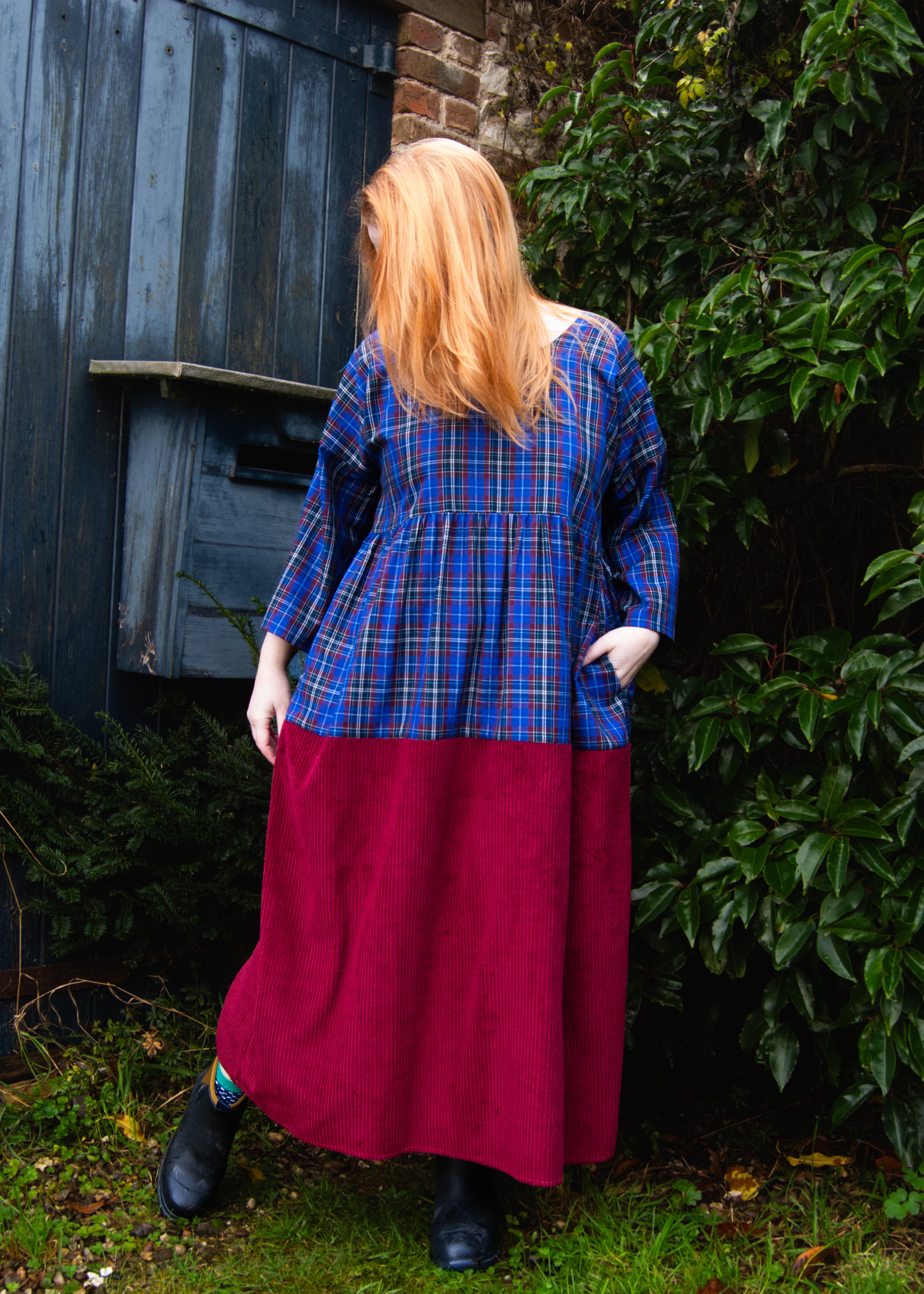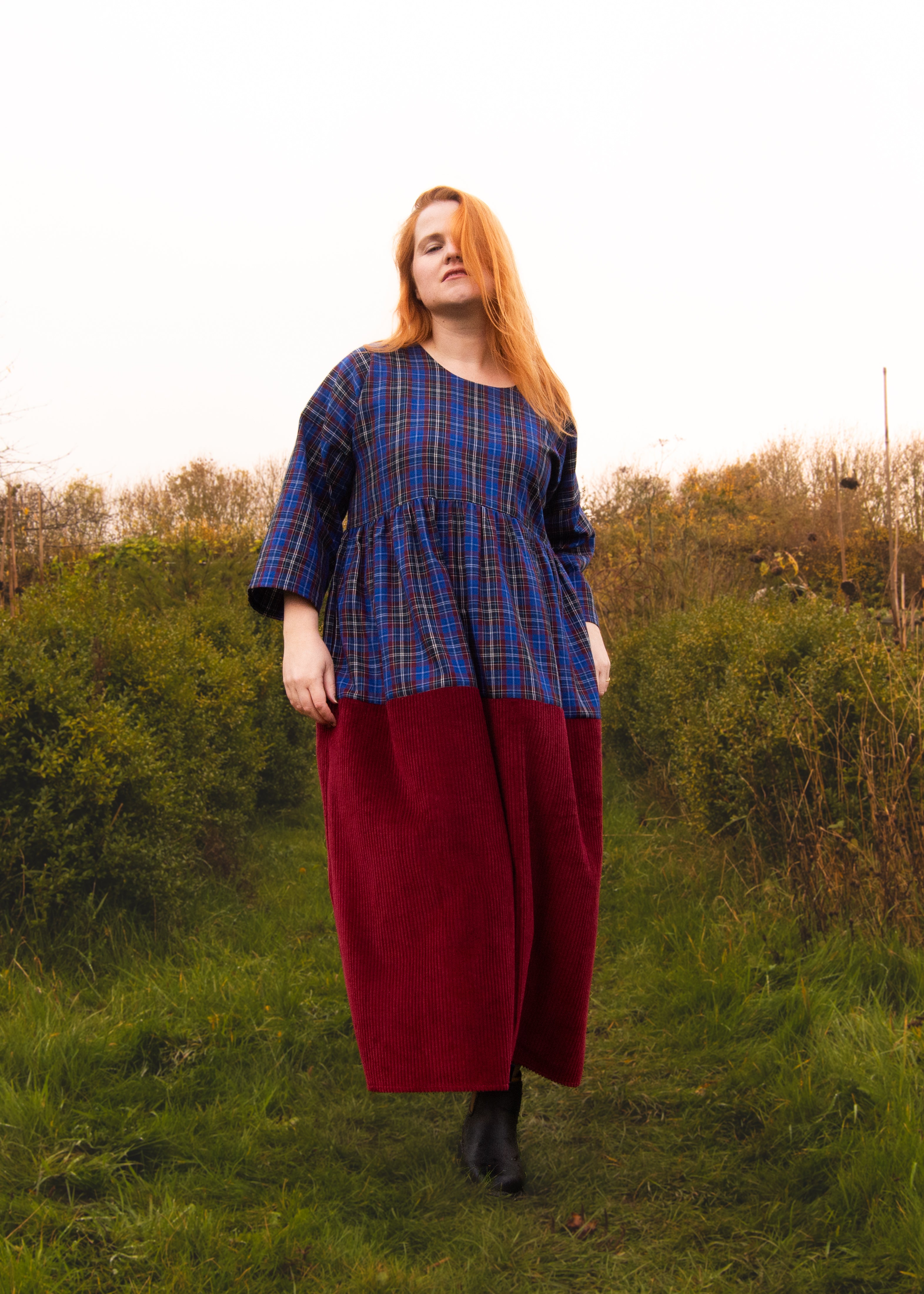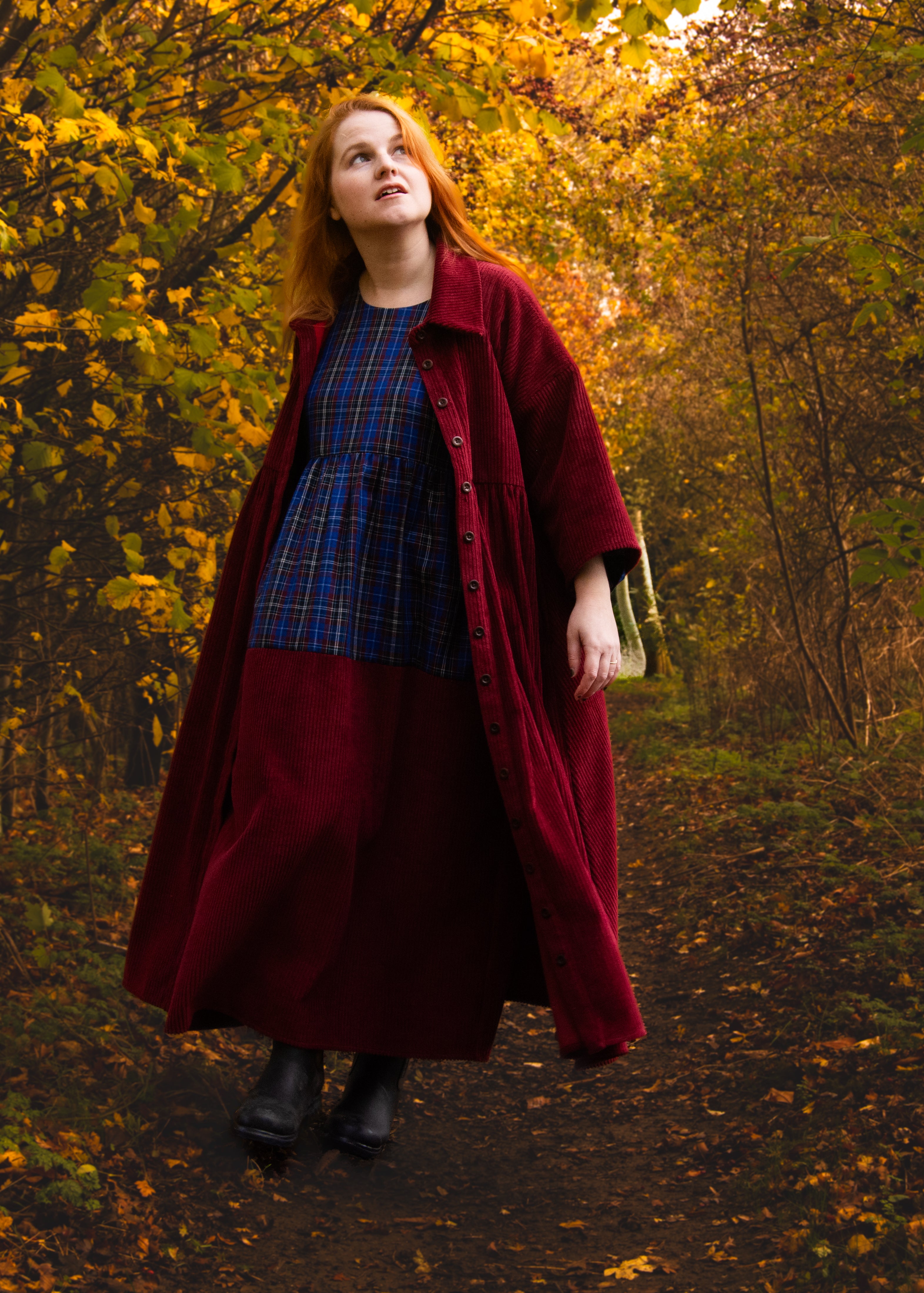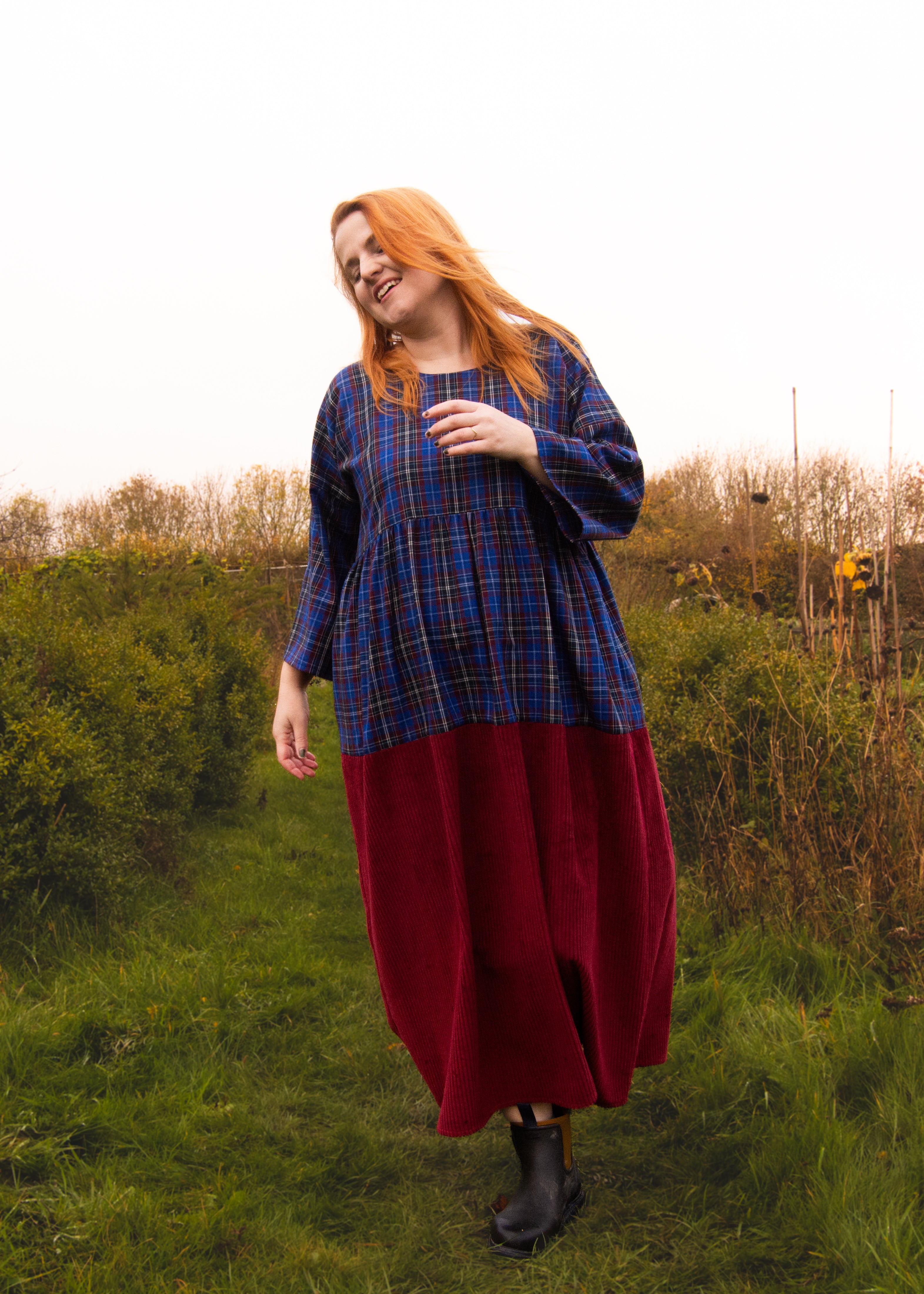 This limited edition version is made in a beautifully soft brushed cotton check — a blend of burgundy and blue tones — with a contrasting wine red corduroy skirt panel that adds texture, warmth, and just the right amount of detail. Cosy, flattering, and unmistakably you.