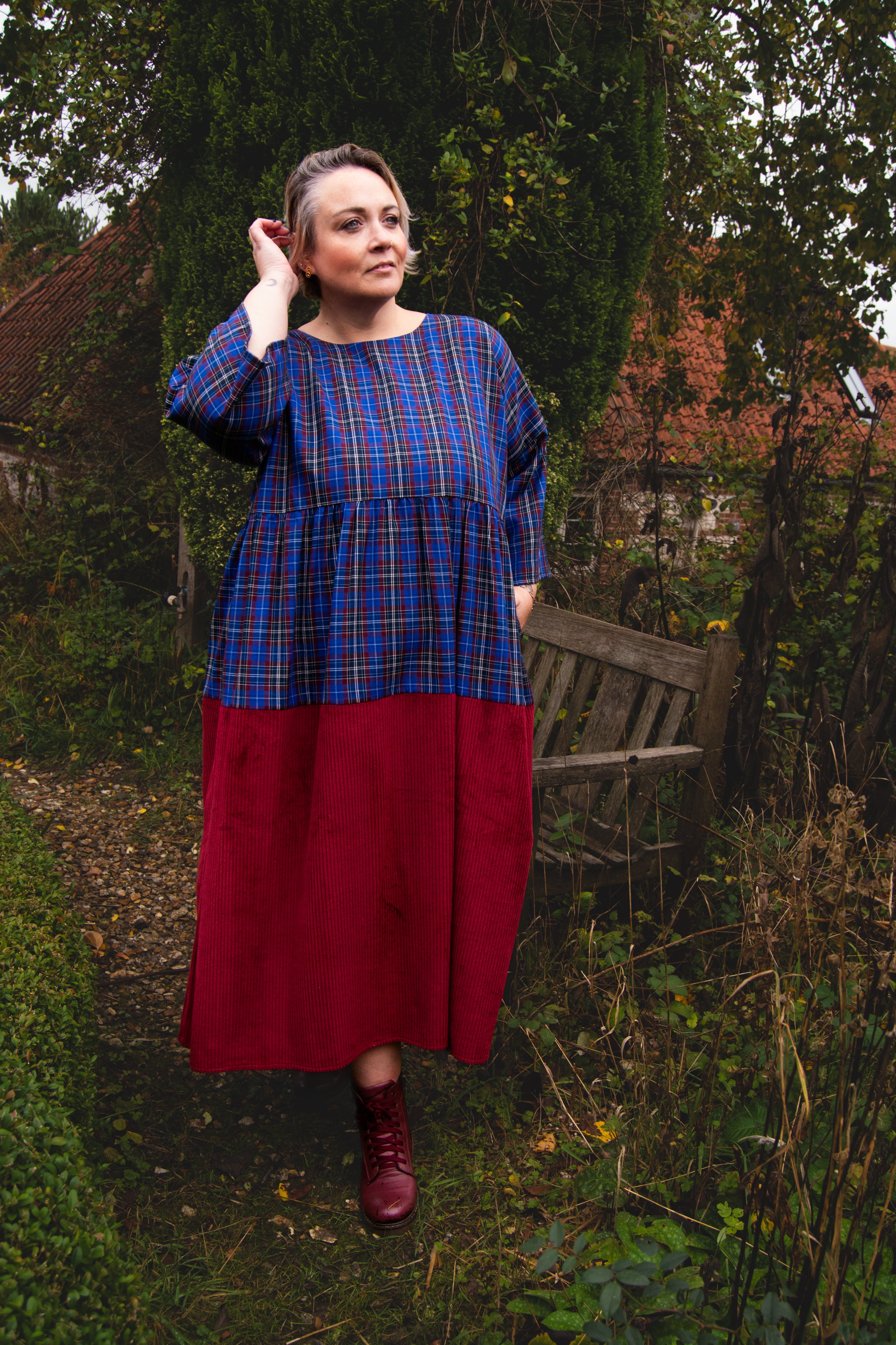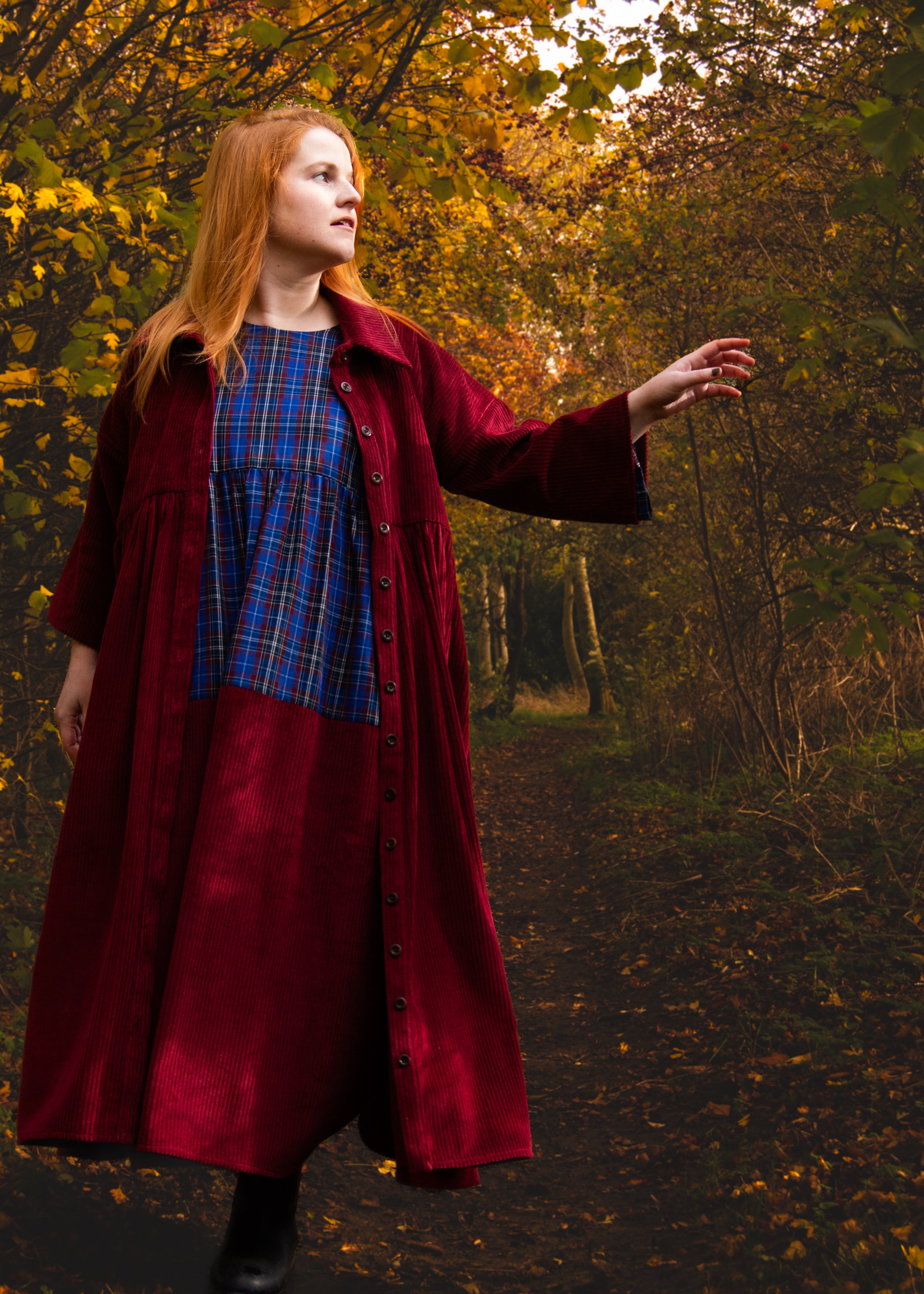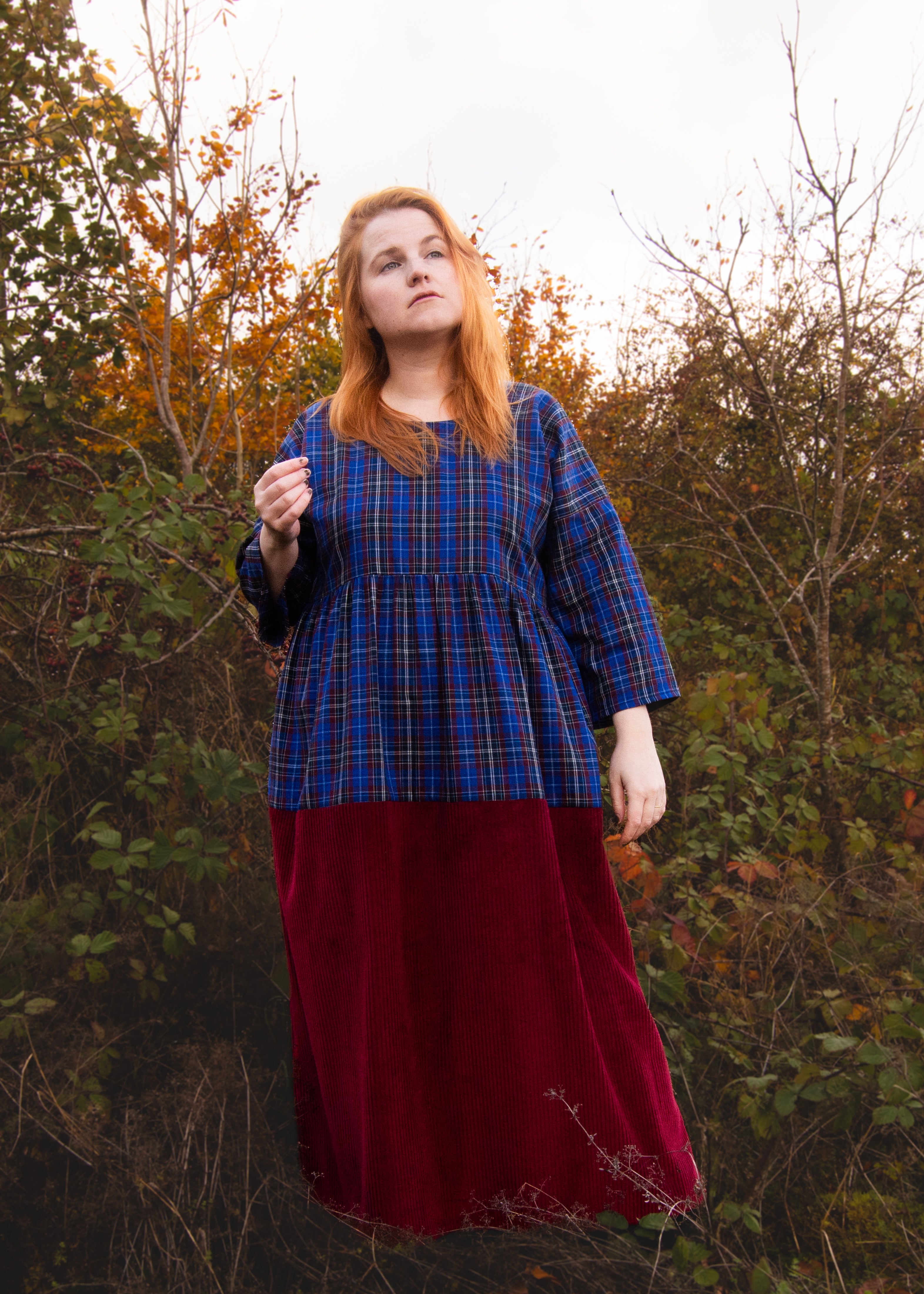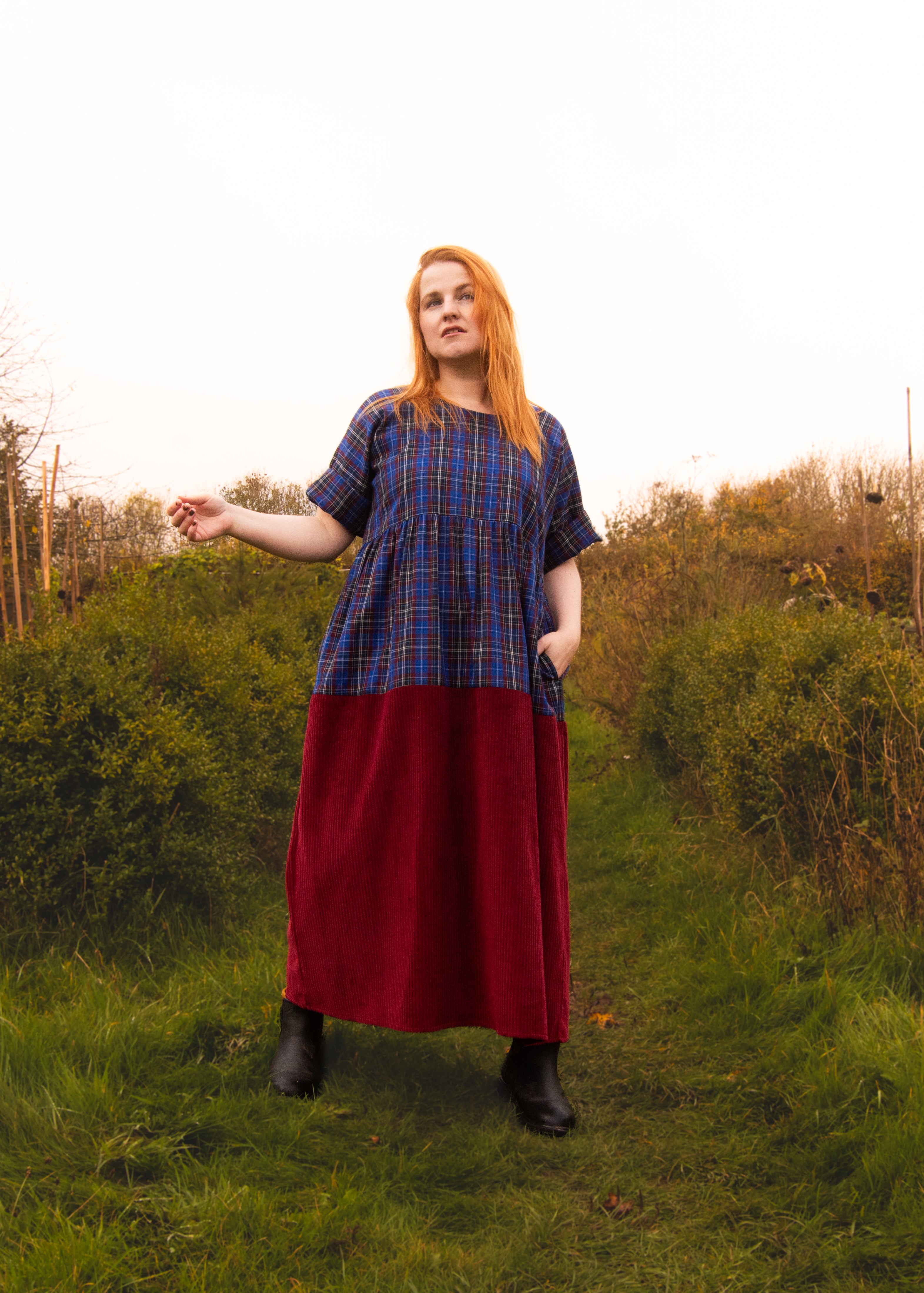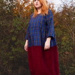 This limited edition version is made in a beautifully soft brushed cotton check — a blend of burgundy and blue tones — with a contrasting wine red corduroy skirt panel that adds texture, warmth, and just the right amount of detail. Cosy, flattering, and unmistakably you.