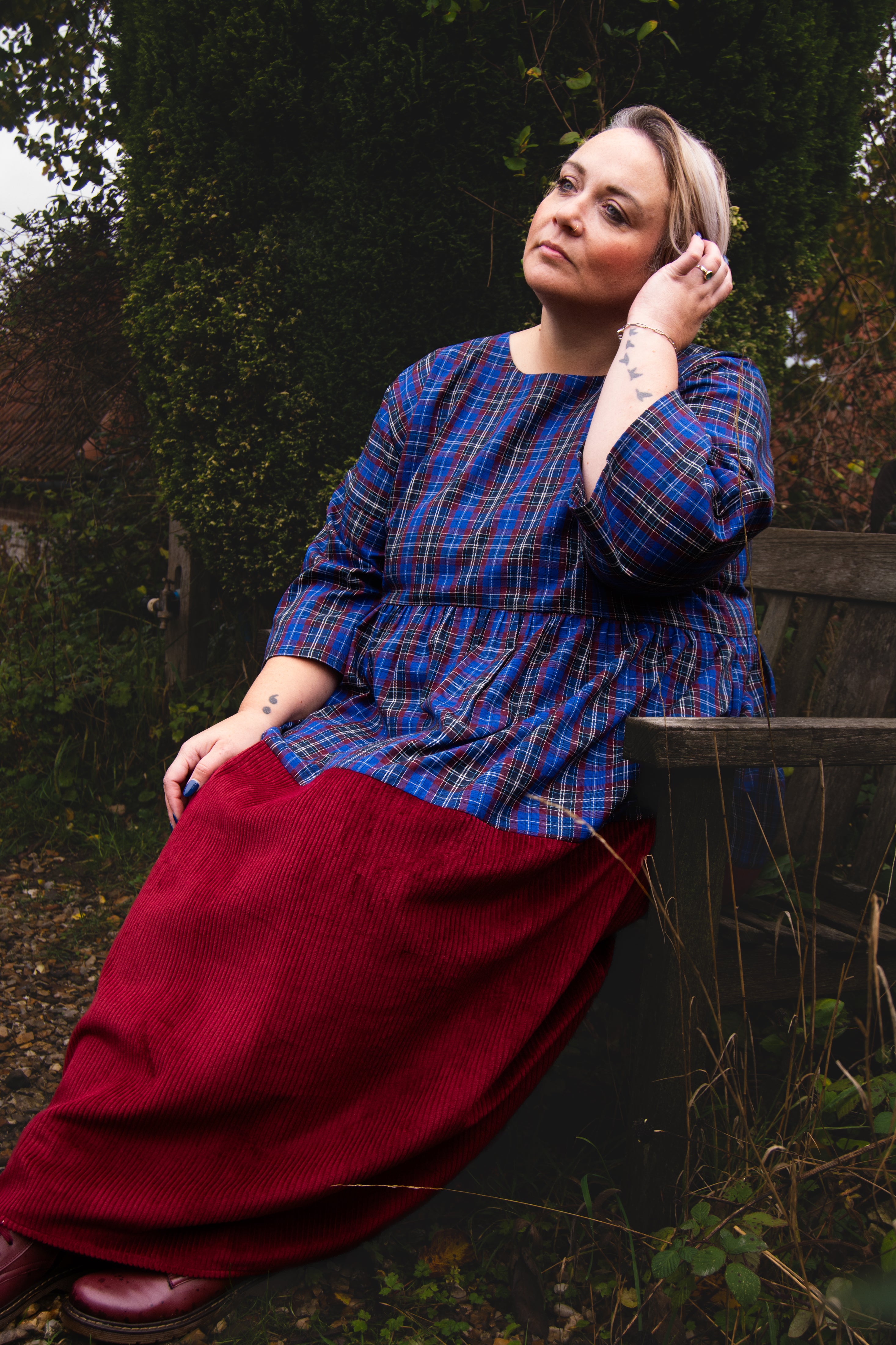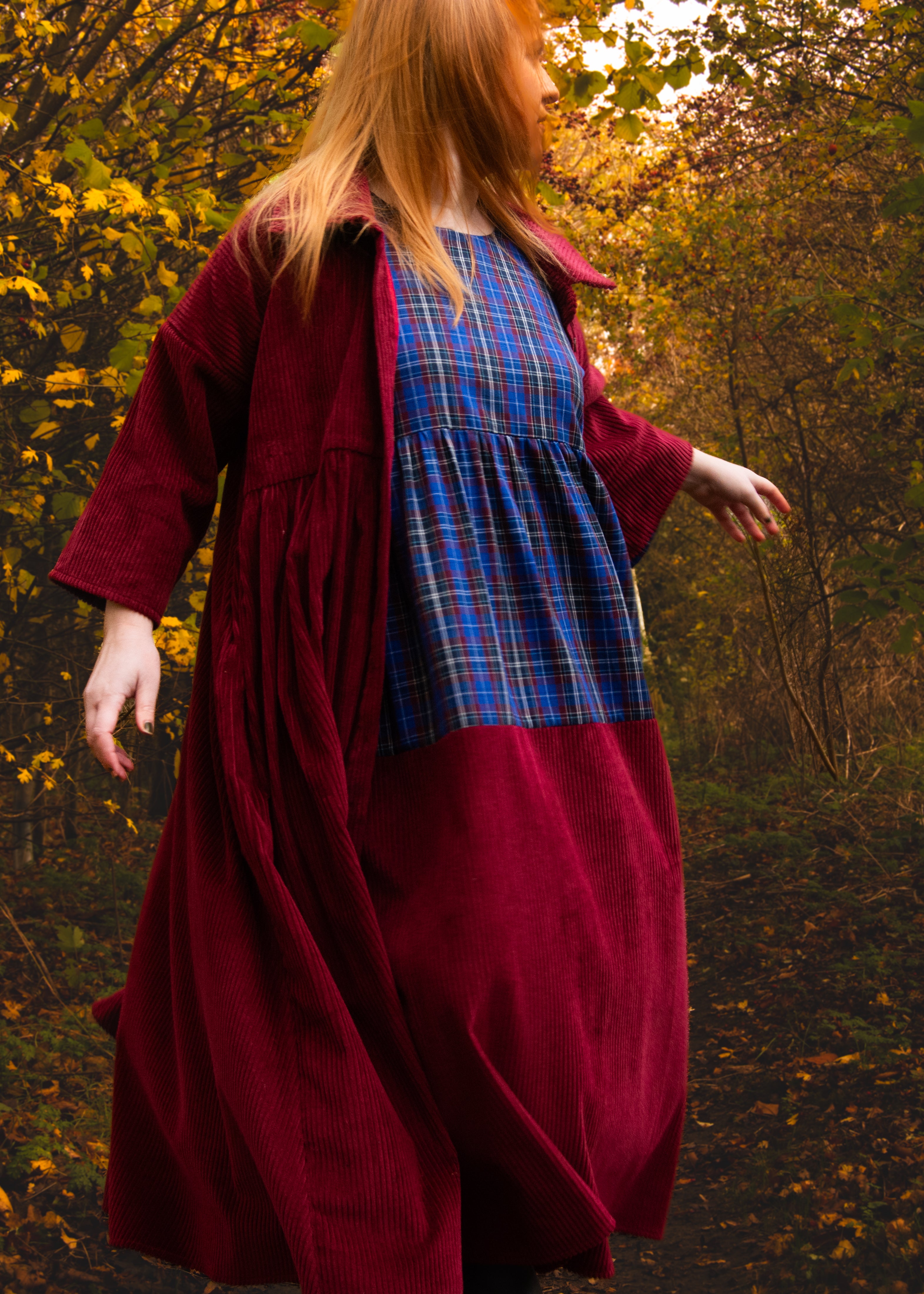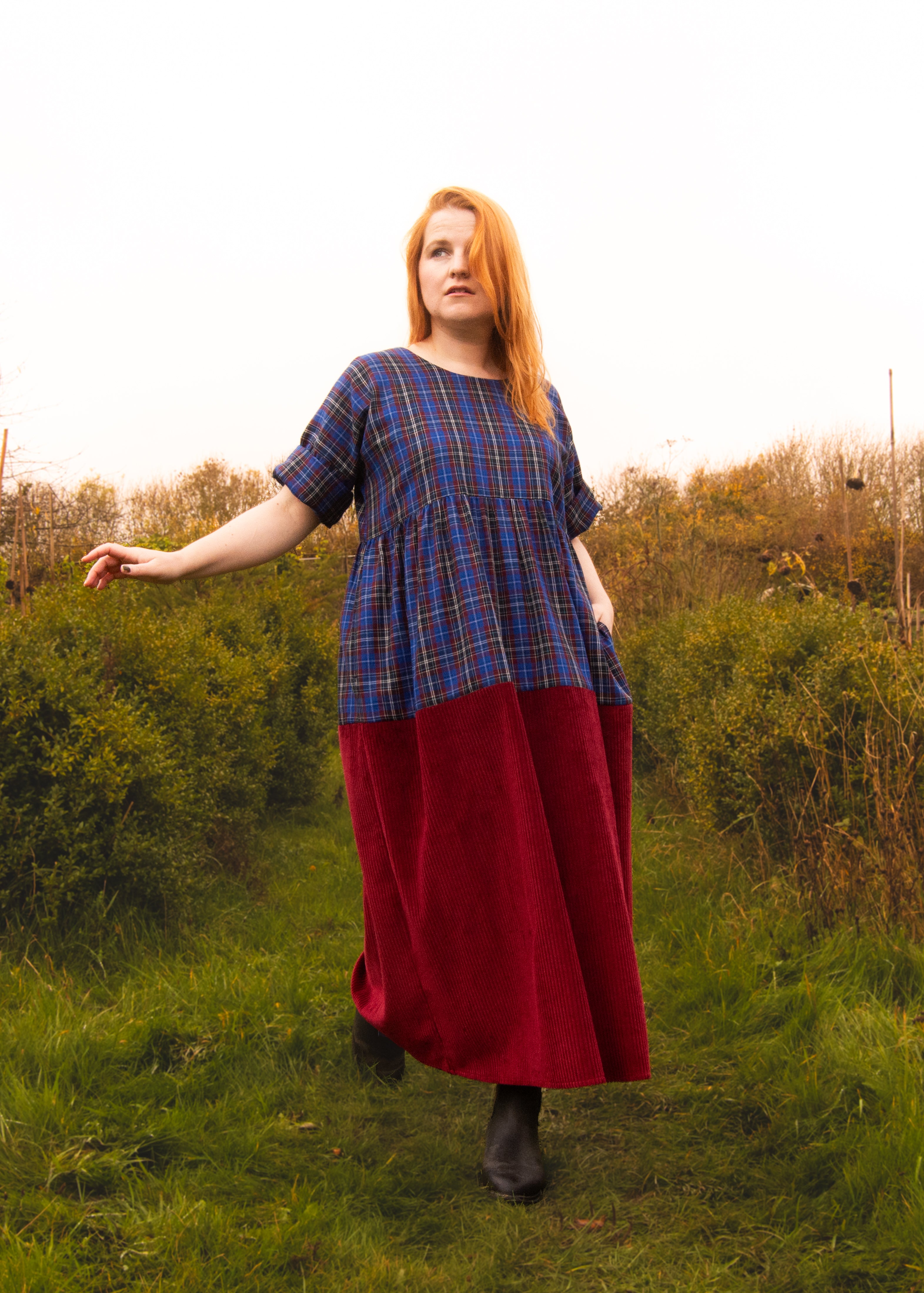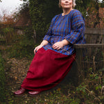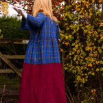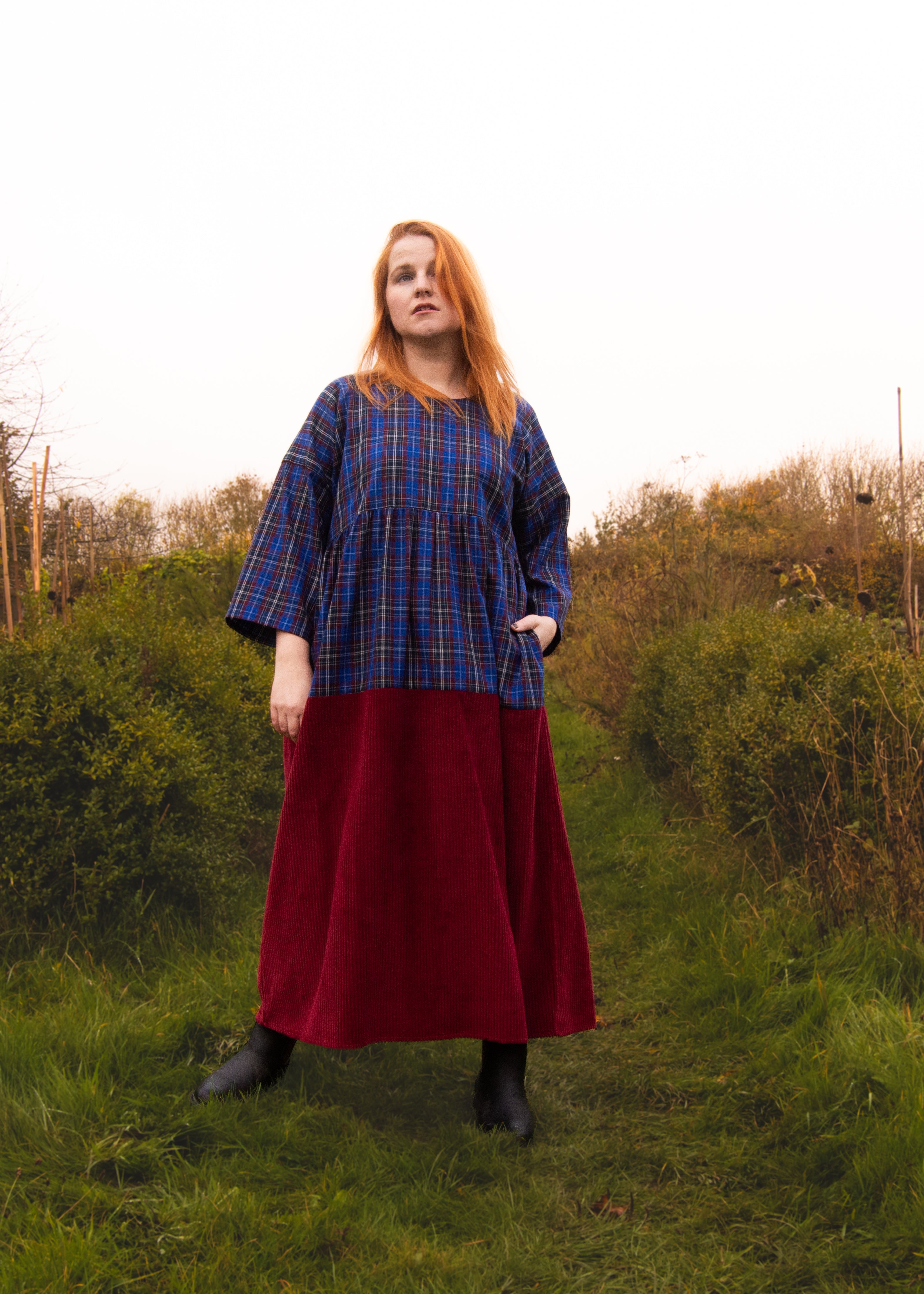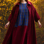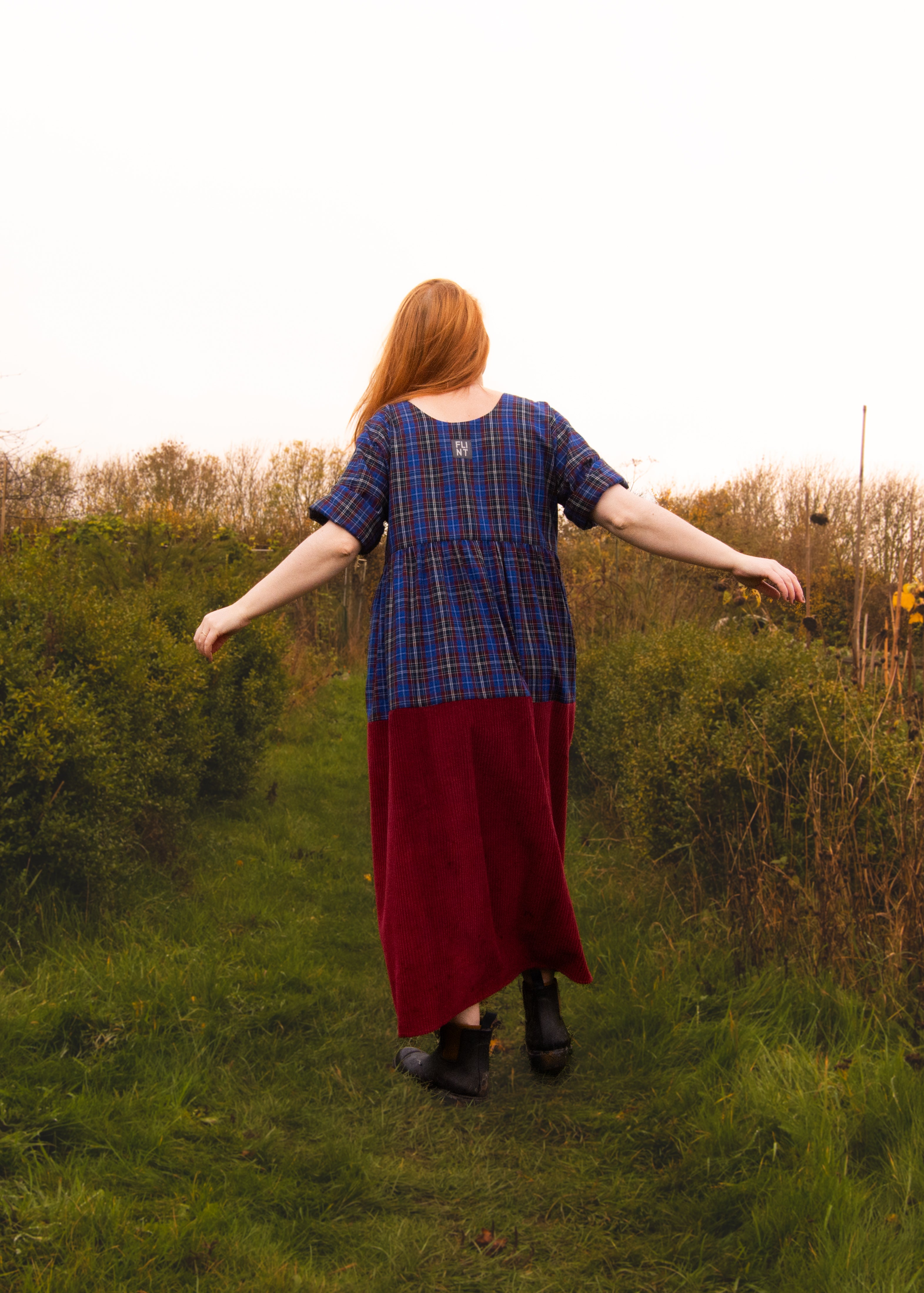 This limited edition version is made in a beautifully soft brushed cotton check — a blend of burgundy and blue tones — with a contrasting wine red corduroy skirt panel that adds texture, warmth, and just the right amount of detail. Cosy, flattering, and unmistakably you.