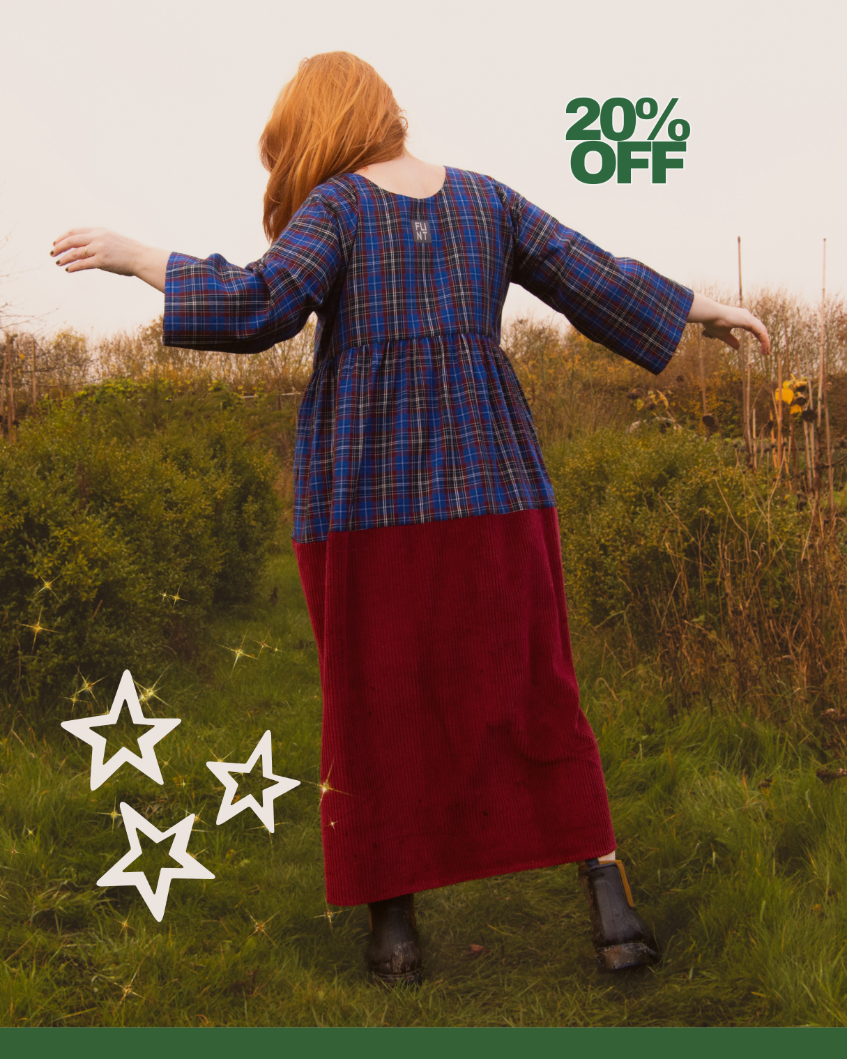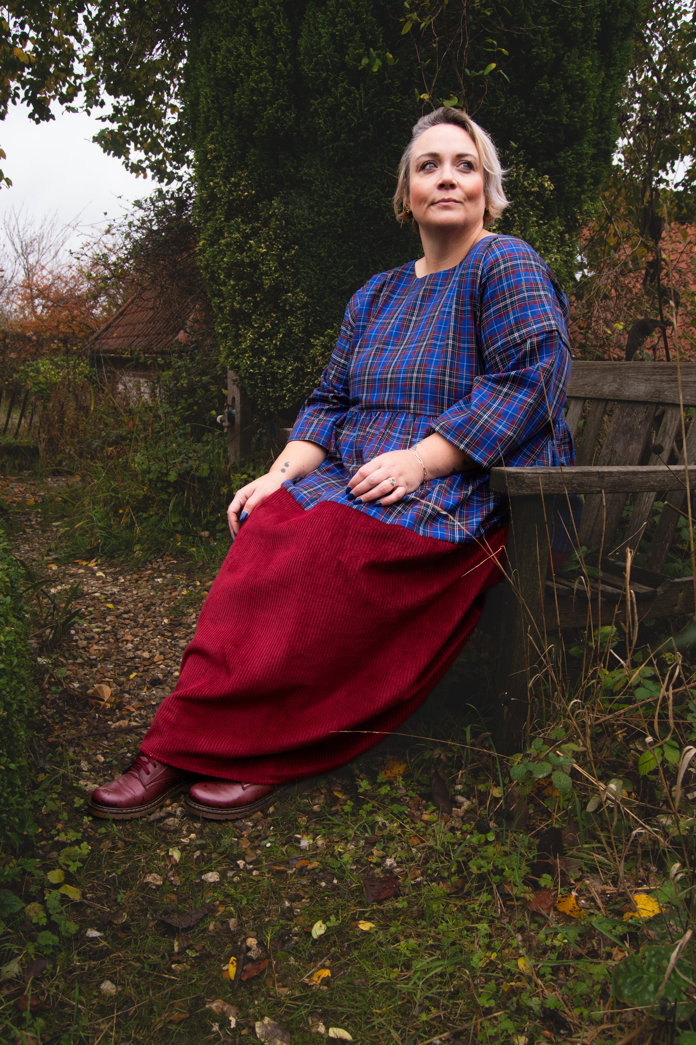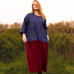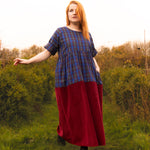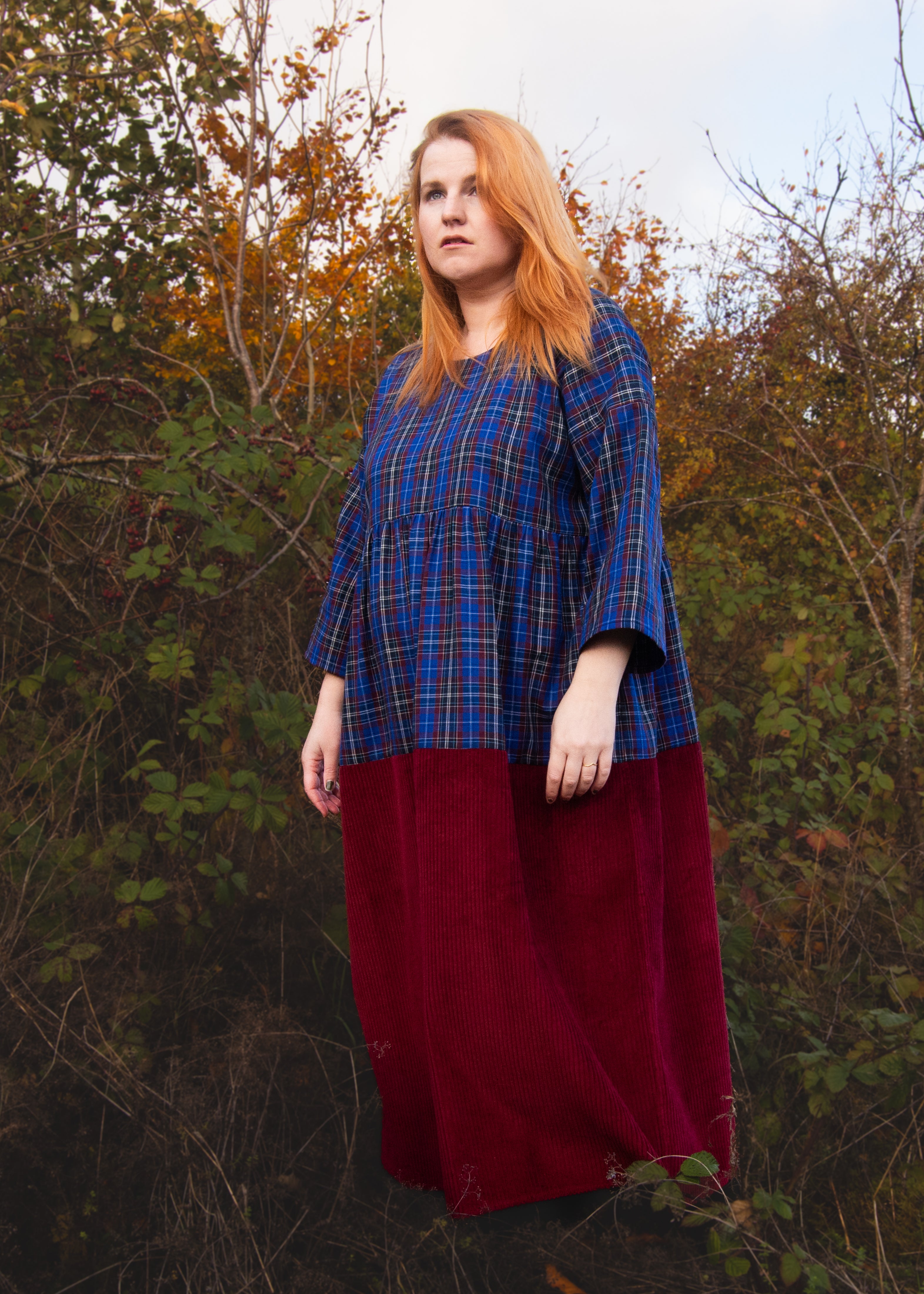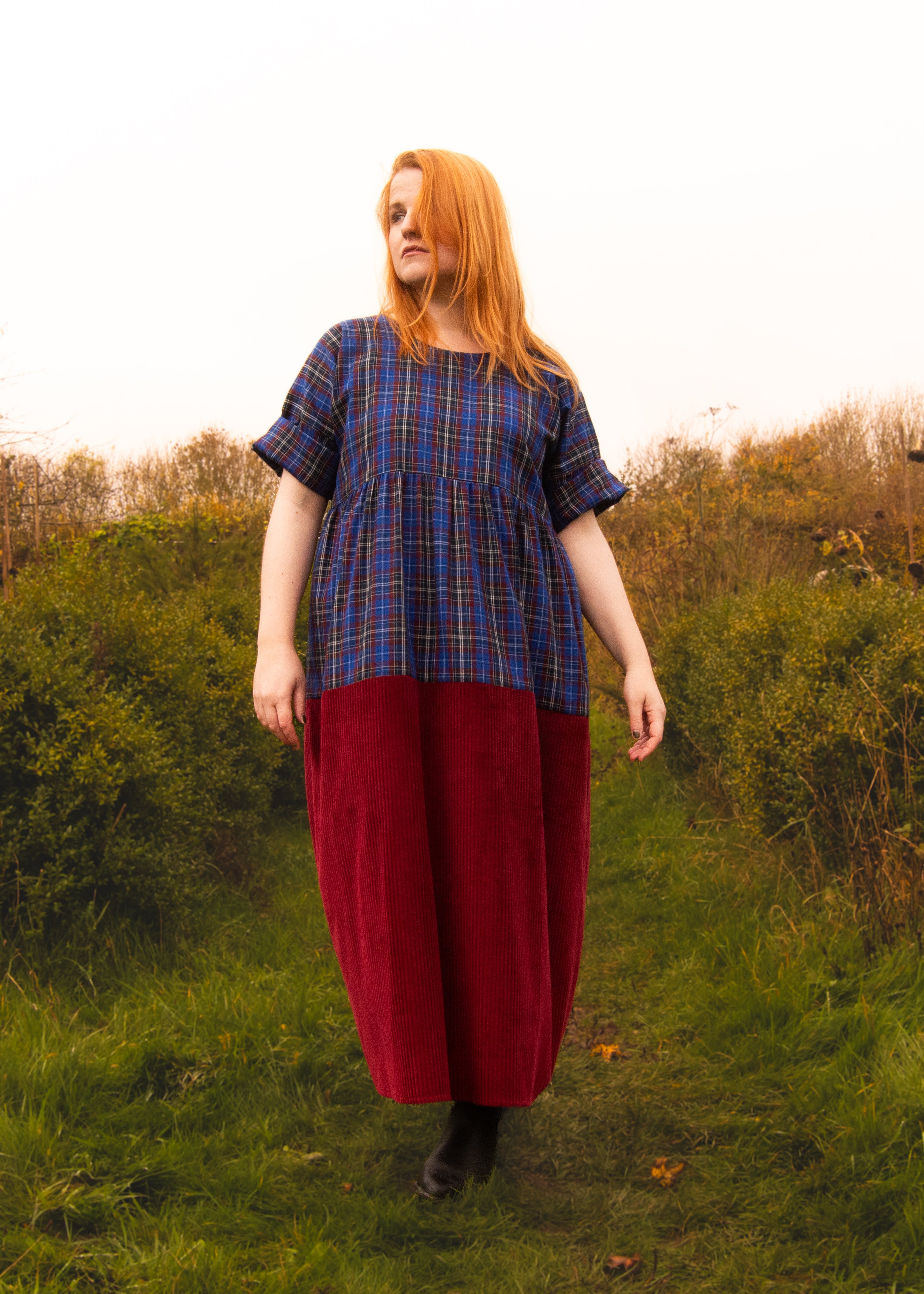 This limited edition version is made in a beautifully soft brushed cotton check — a blend of burgundy and blue tones — with a contrasting wine red corduroy skirt panel that adds texture, warmth, and just the right amount of detail. Cosy, flattering, and unmistakably you.