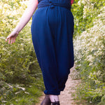 The ties begin at the shoulder and cross over the back to go through belt loops at each side seam. Tie to the front or wrap around again to the back for a tighter finish! With these ties you can also adjust where the jumpsuit sits on your body - pull it up higher or lower to position in the right place (and avoid a hungry bum!).
