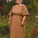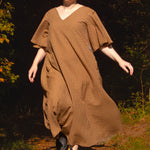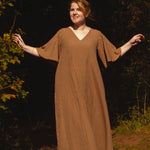 This is a more fitted style at the bust and loose and flowing through the waist and hip (unless you nip in at the waist with the removable waist tie). Pay attention to the bust measurement - this should be a couple of inches larger than your actual bust (see size guide tab) to ensure a great fit. If you are in between sizes we recommend sizing up!
