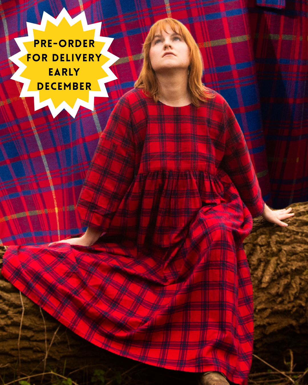 Back by popular demand, our bestselling check everything dress returns in a brand new deadstock red brushed cotton flannel. This exclusive edition features a brighter blue and subtle yellow thread woven through the red — adding warmth, depth, and that perfect festive feel (without being only for Christmas).