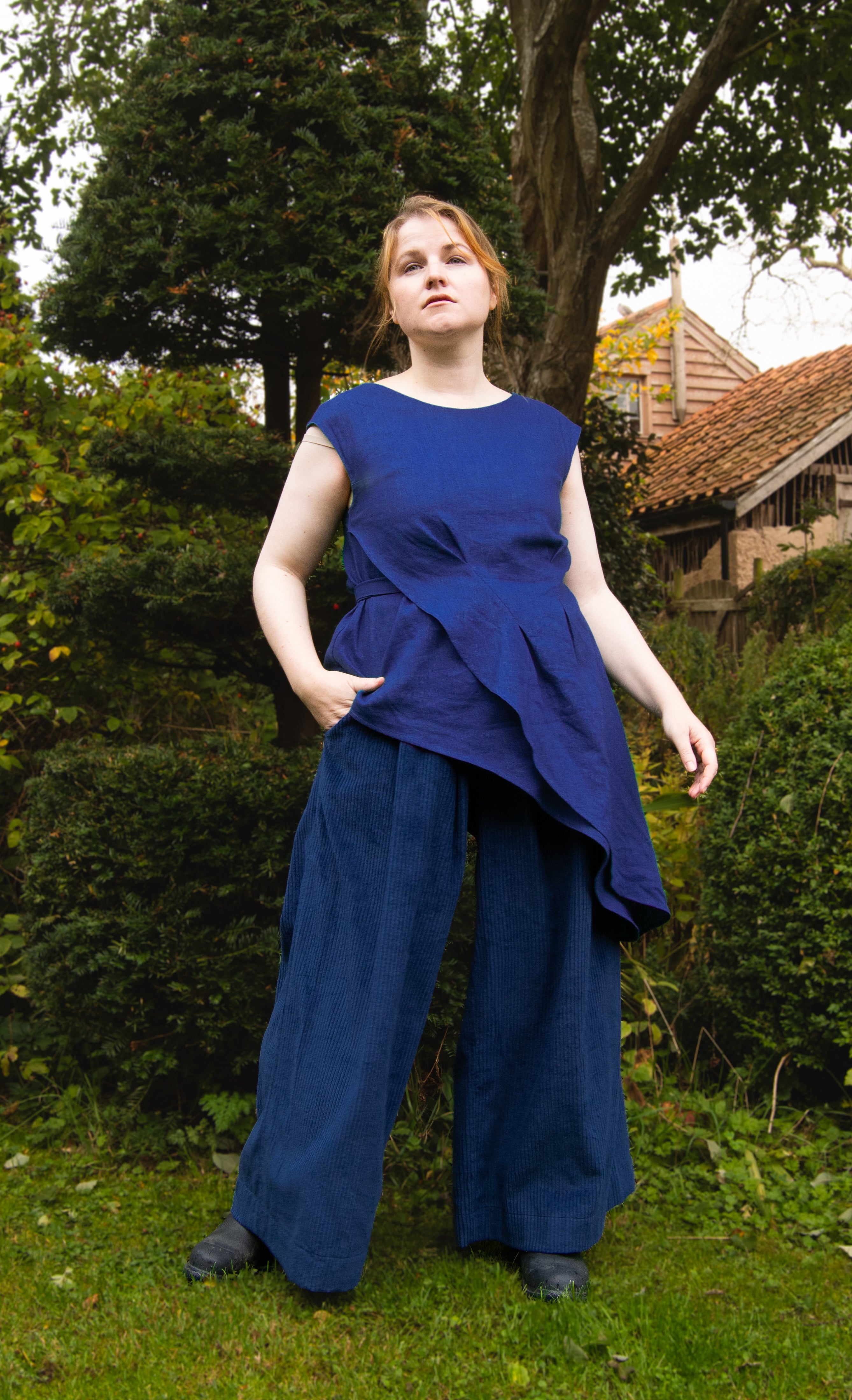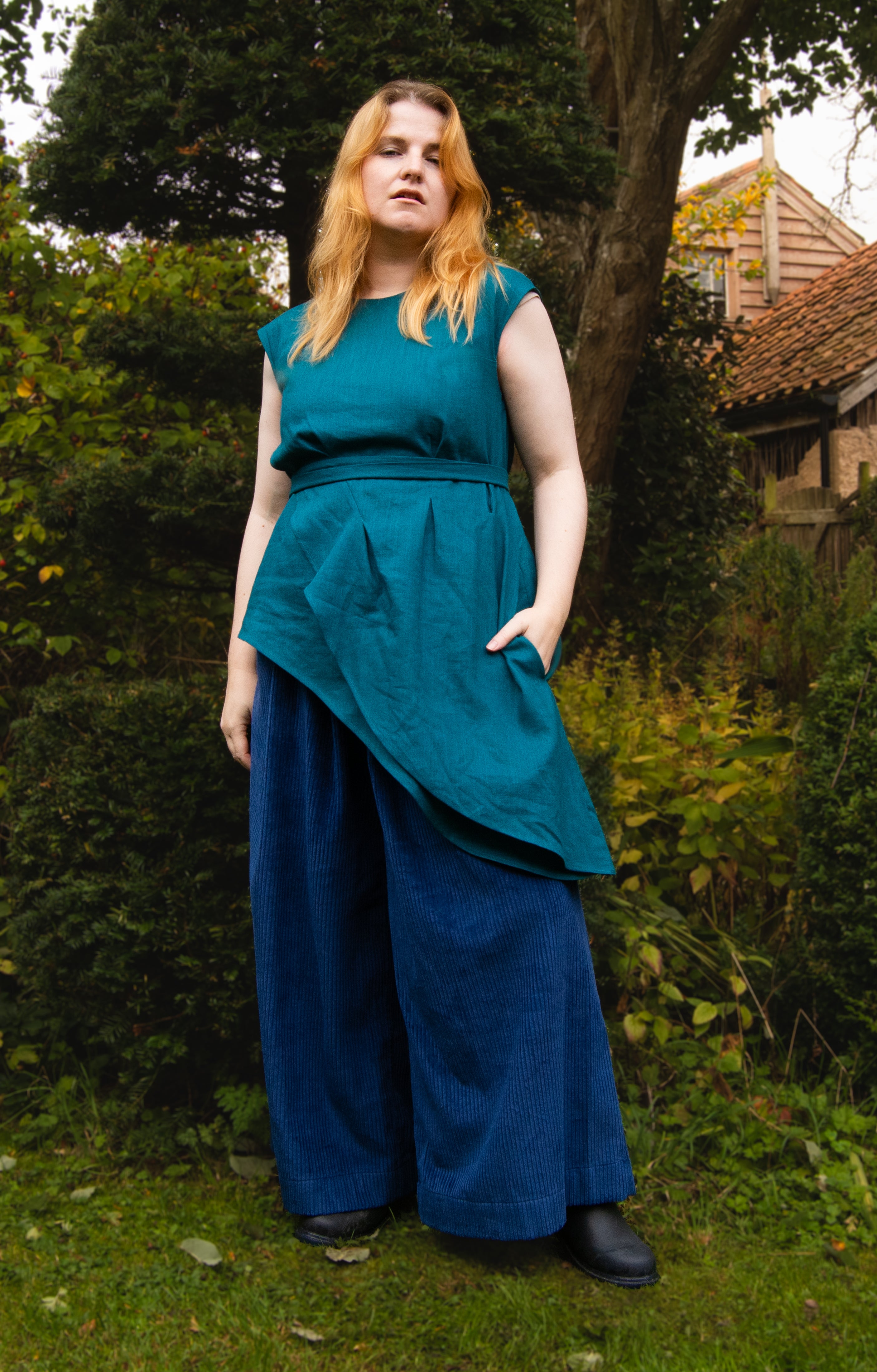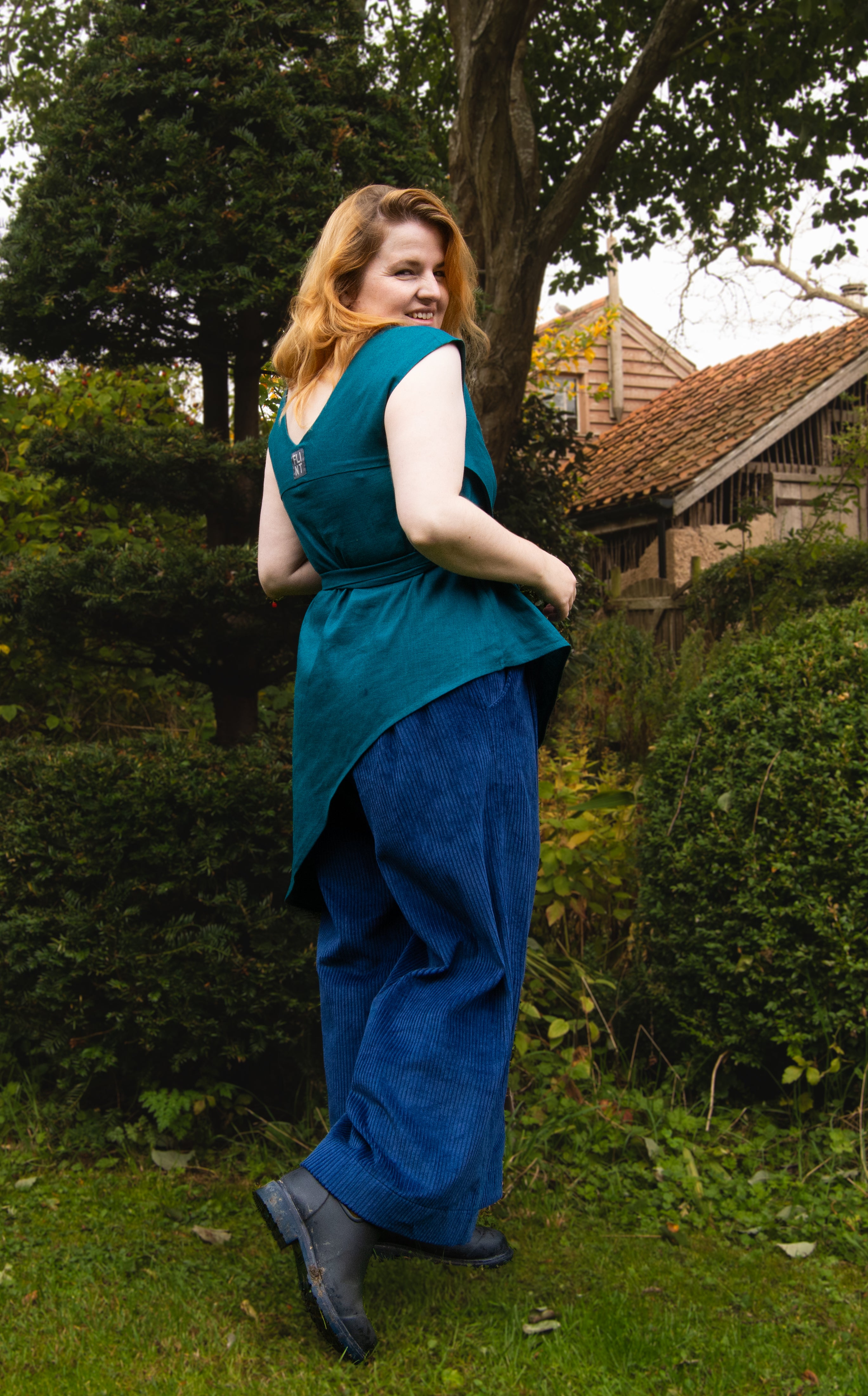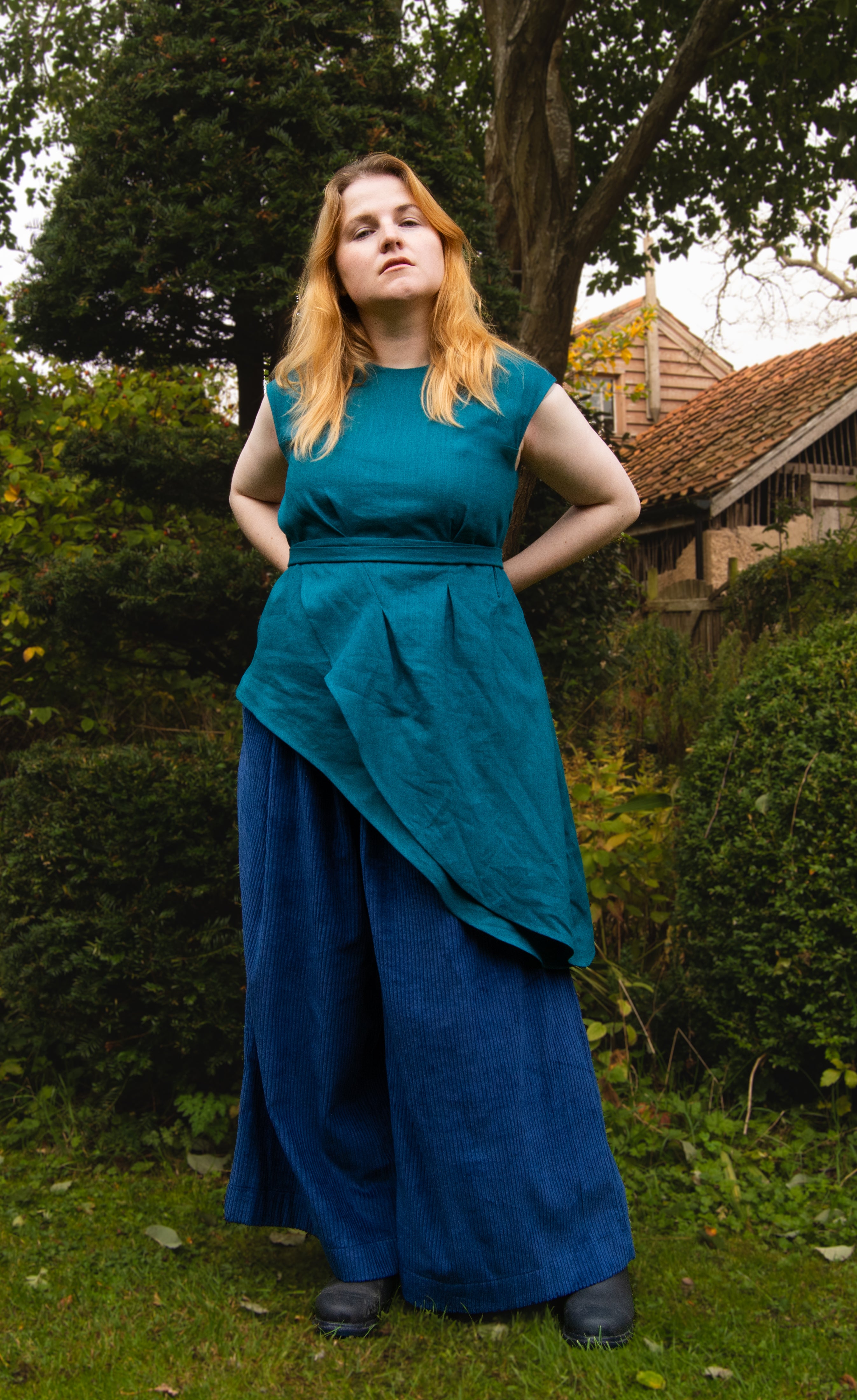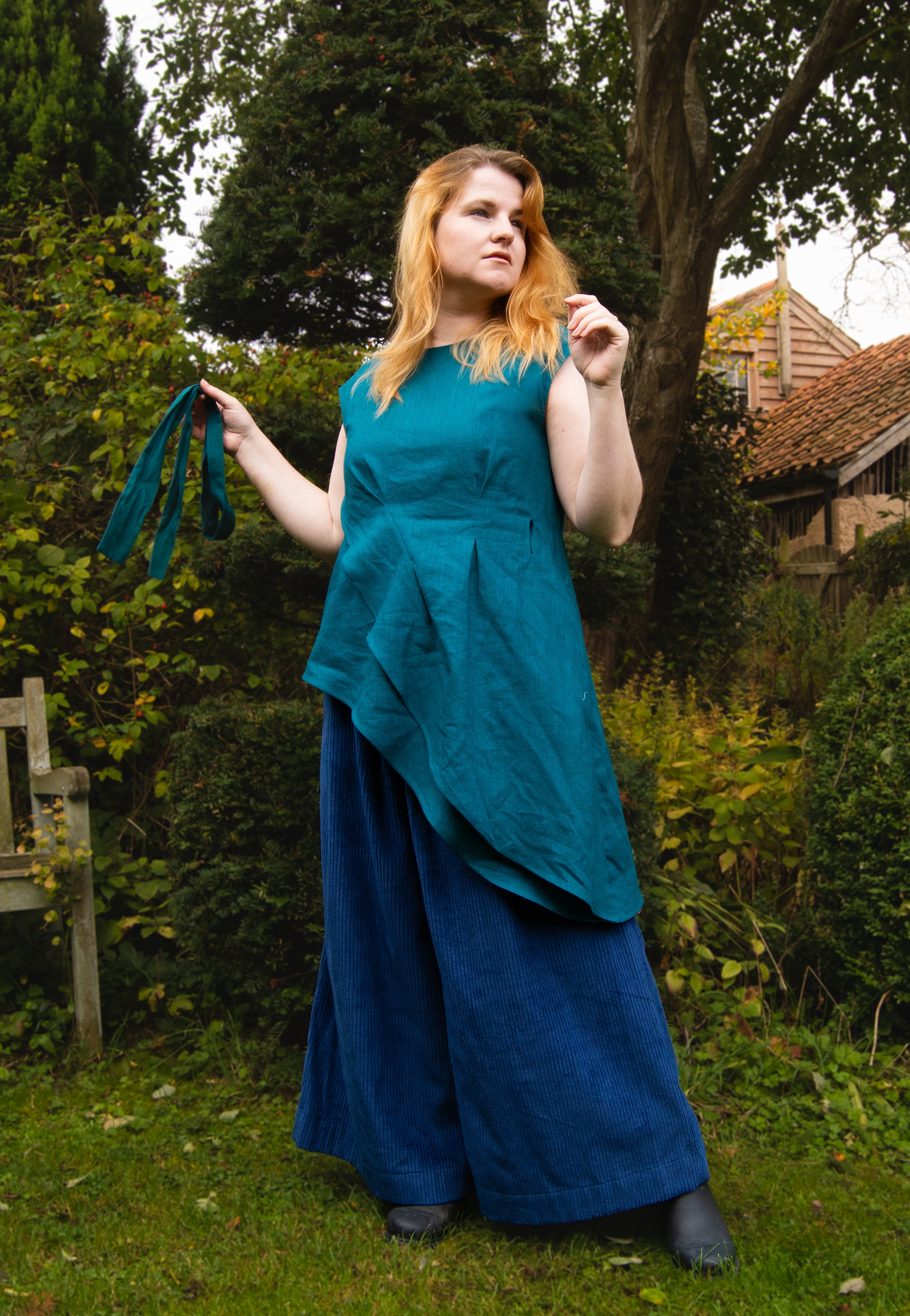 With a faux wrap at the front, shape is created with pleats on this area. The tie slips beneath though a hidden hole (only through the top layer) to wrap around the back without catching the wrap! You could also wear loose, or wrap the waist fully (see images).