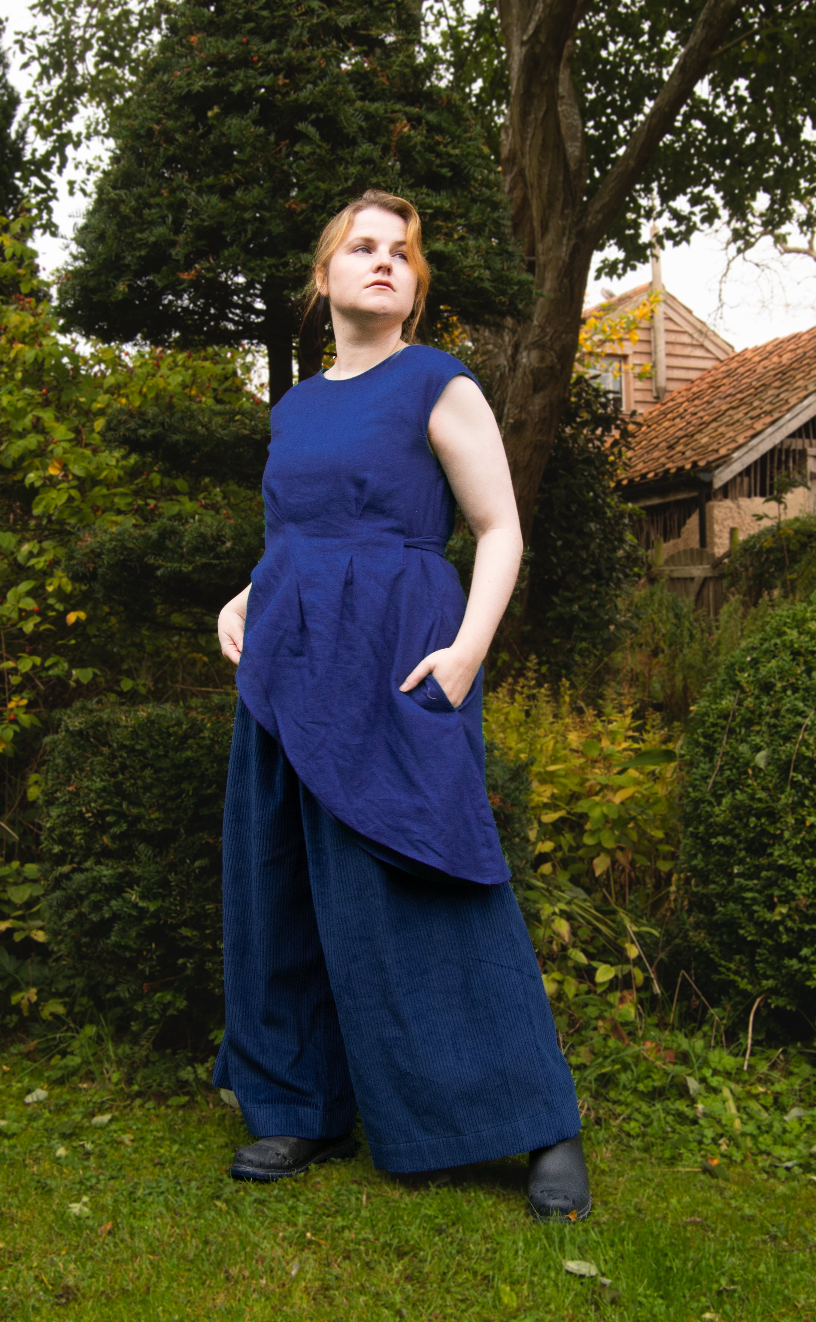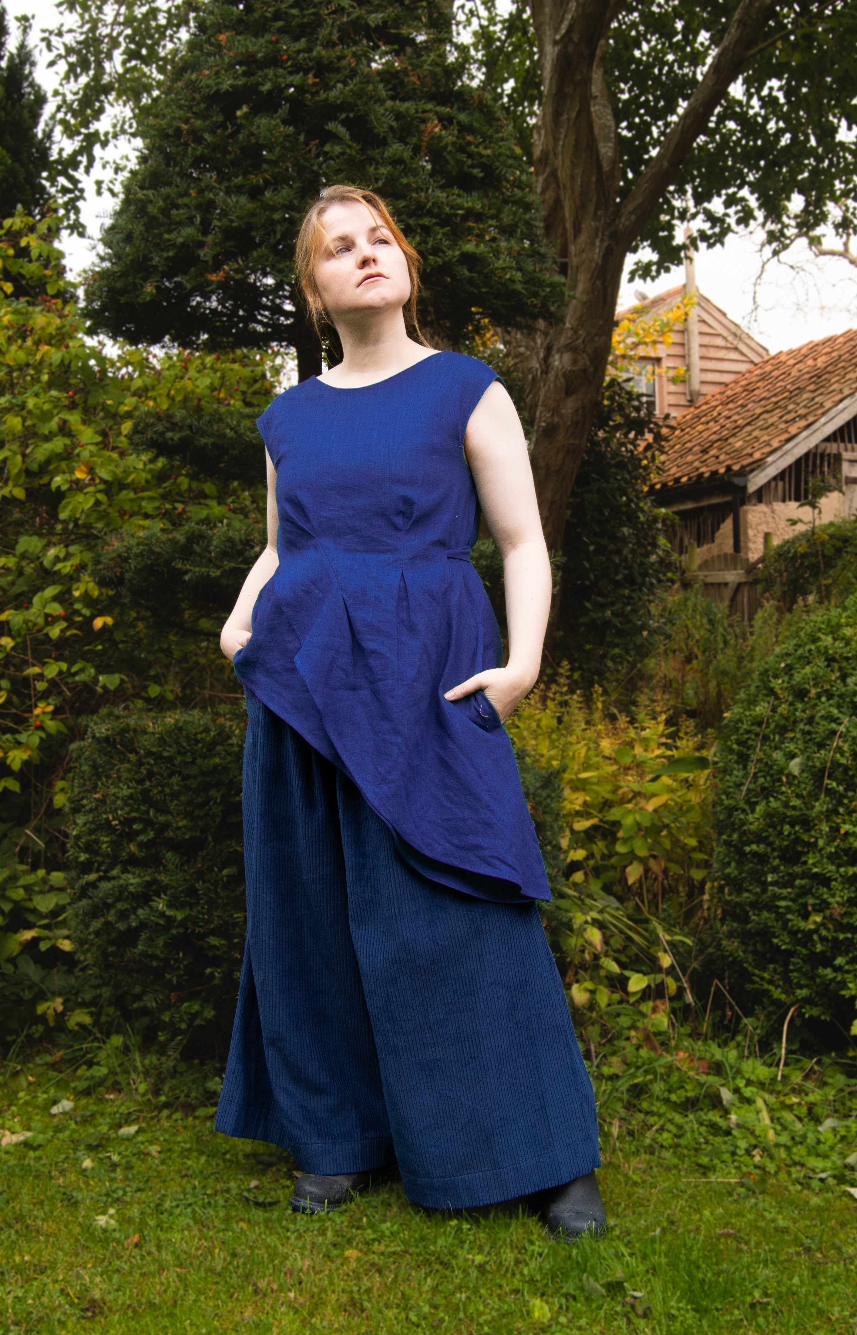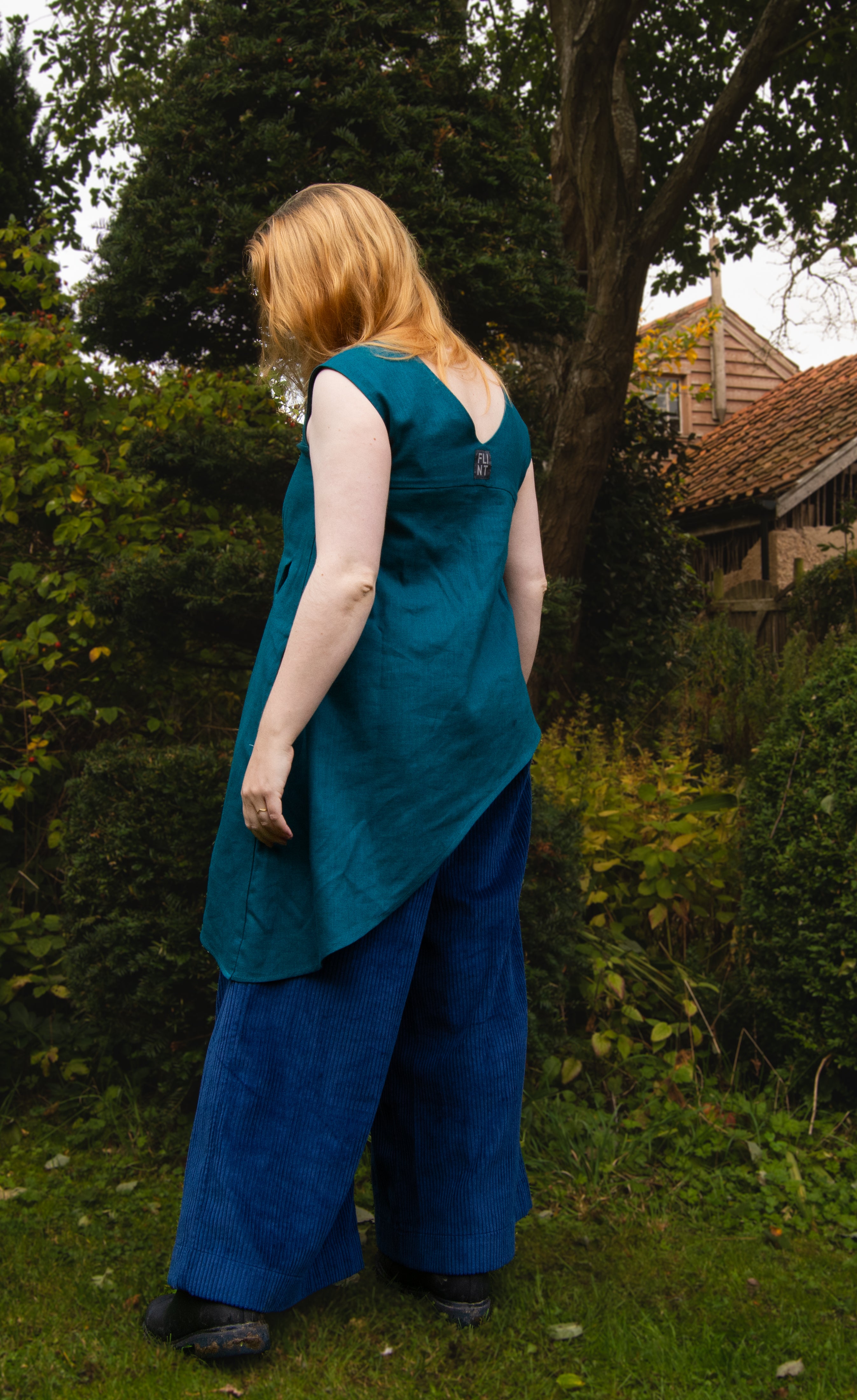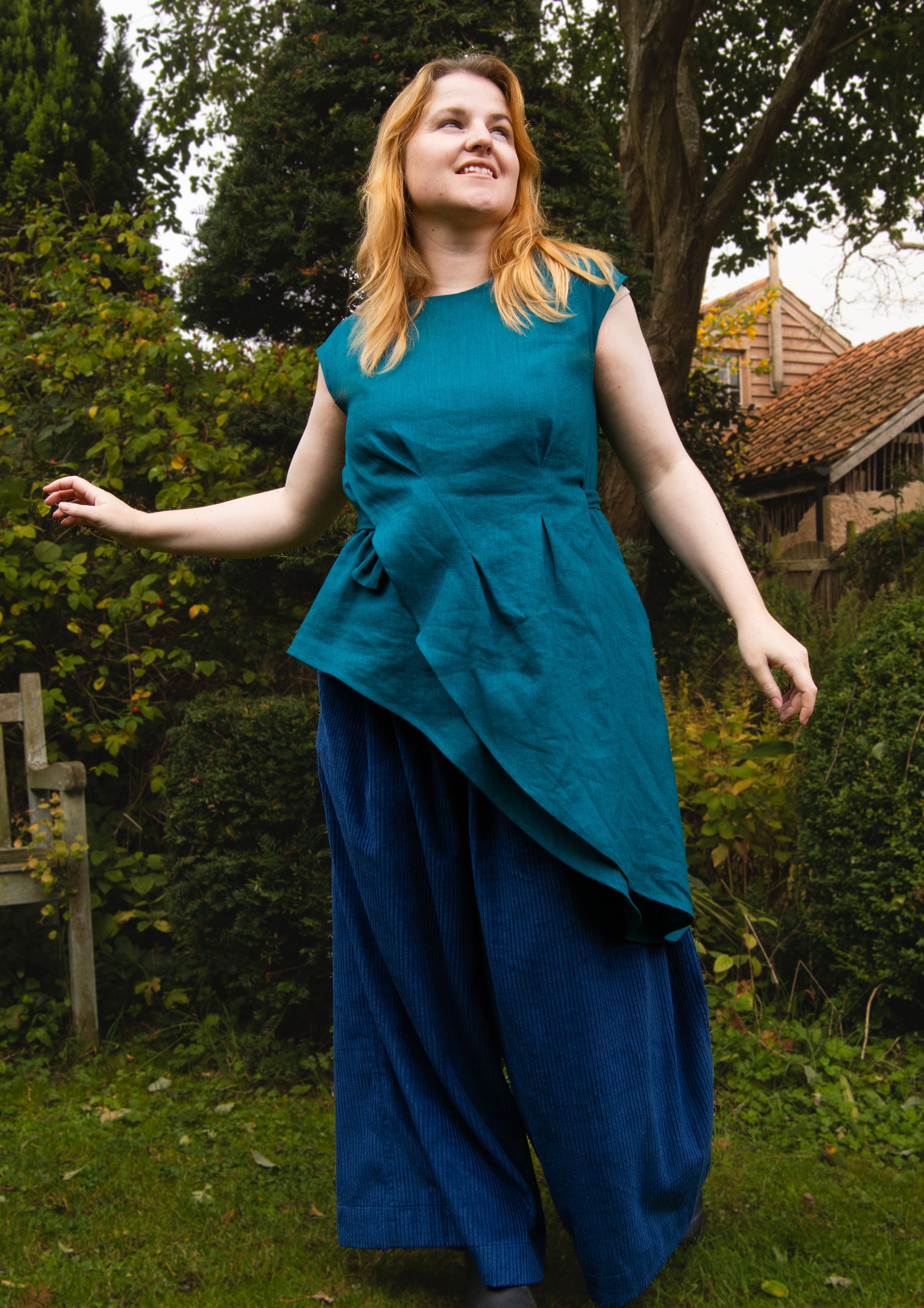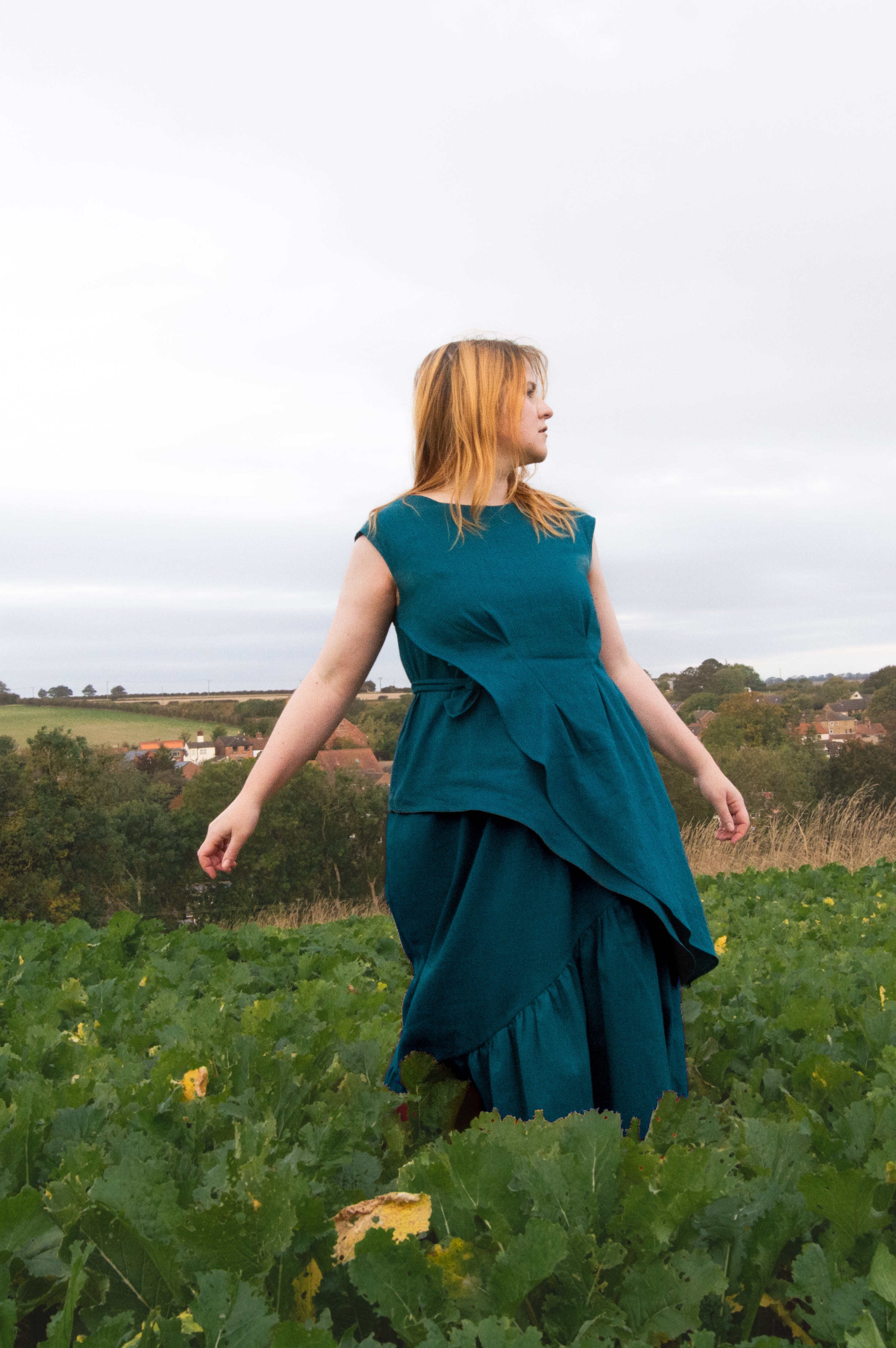 With a faux wrap at the front, shape is created with pleats on this area. The tie slips beneath though a hidden hole (only through the top layer) to wrap around the back without catching the wrap! You could also wear loose, or wrap the waist fully (see images).