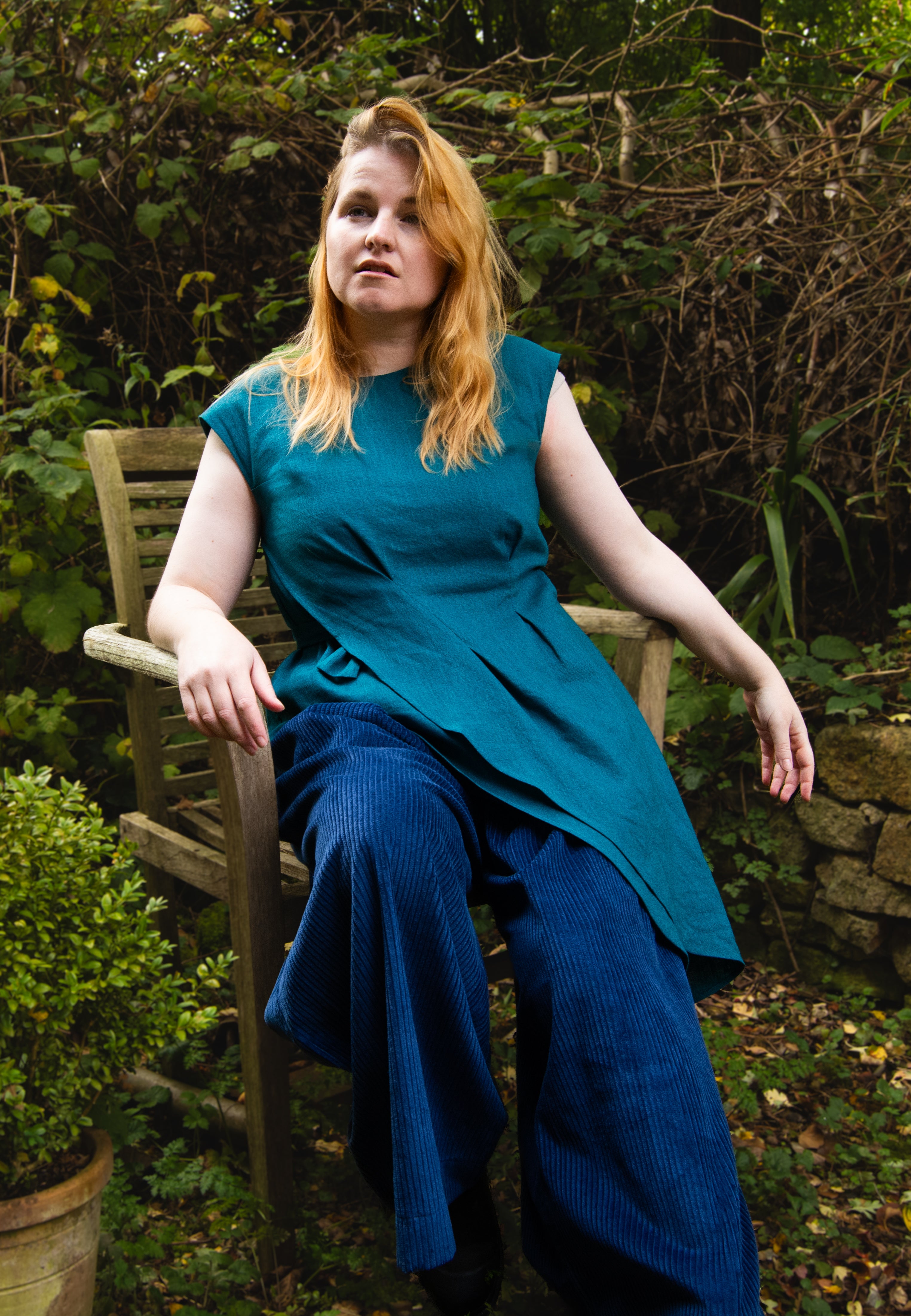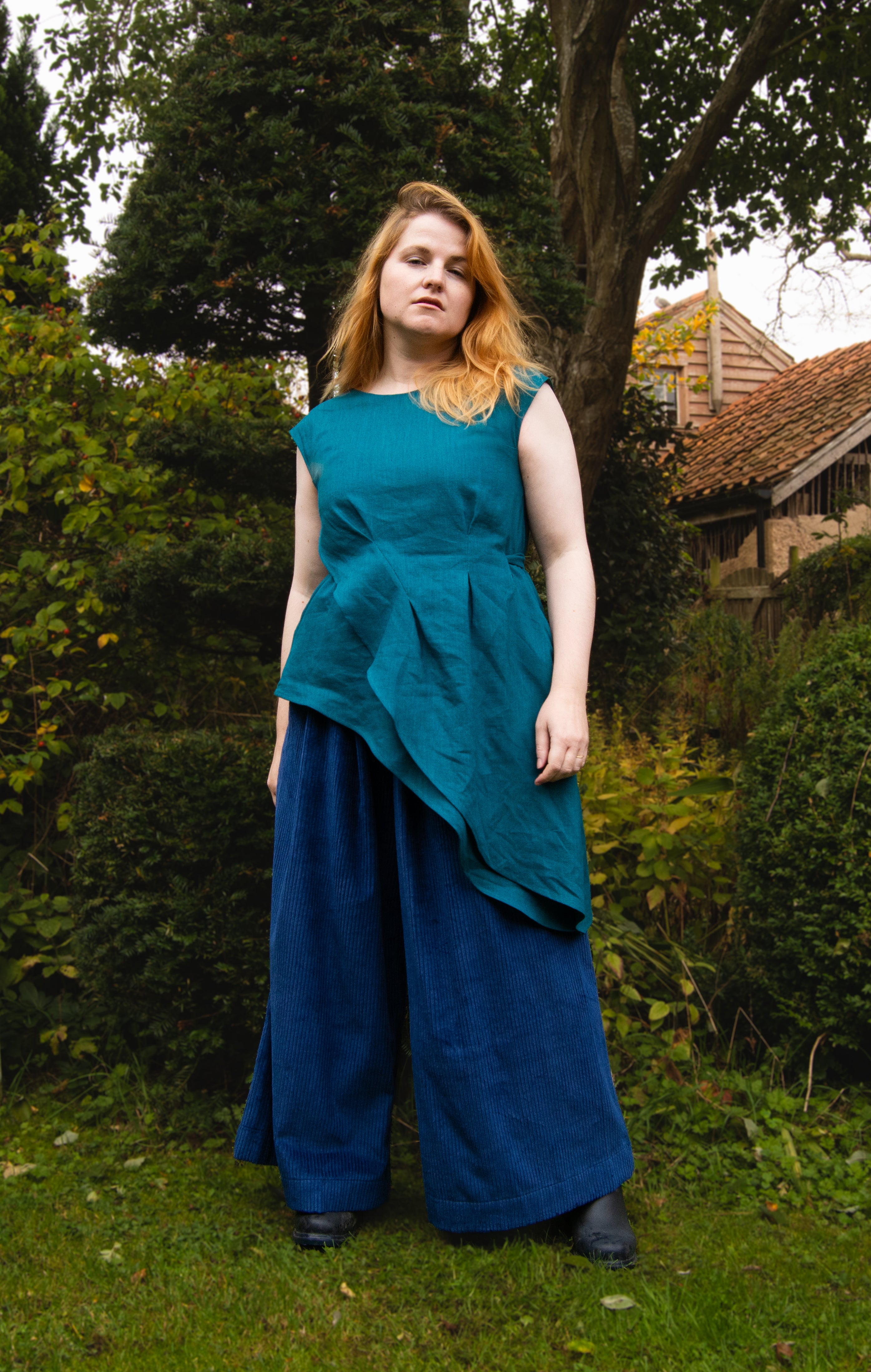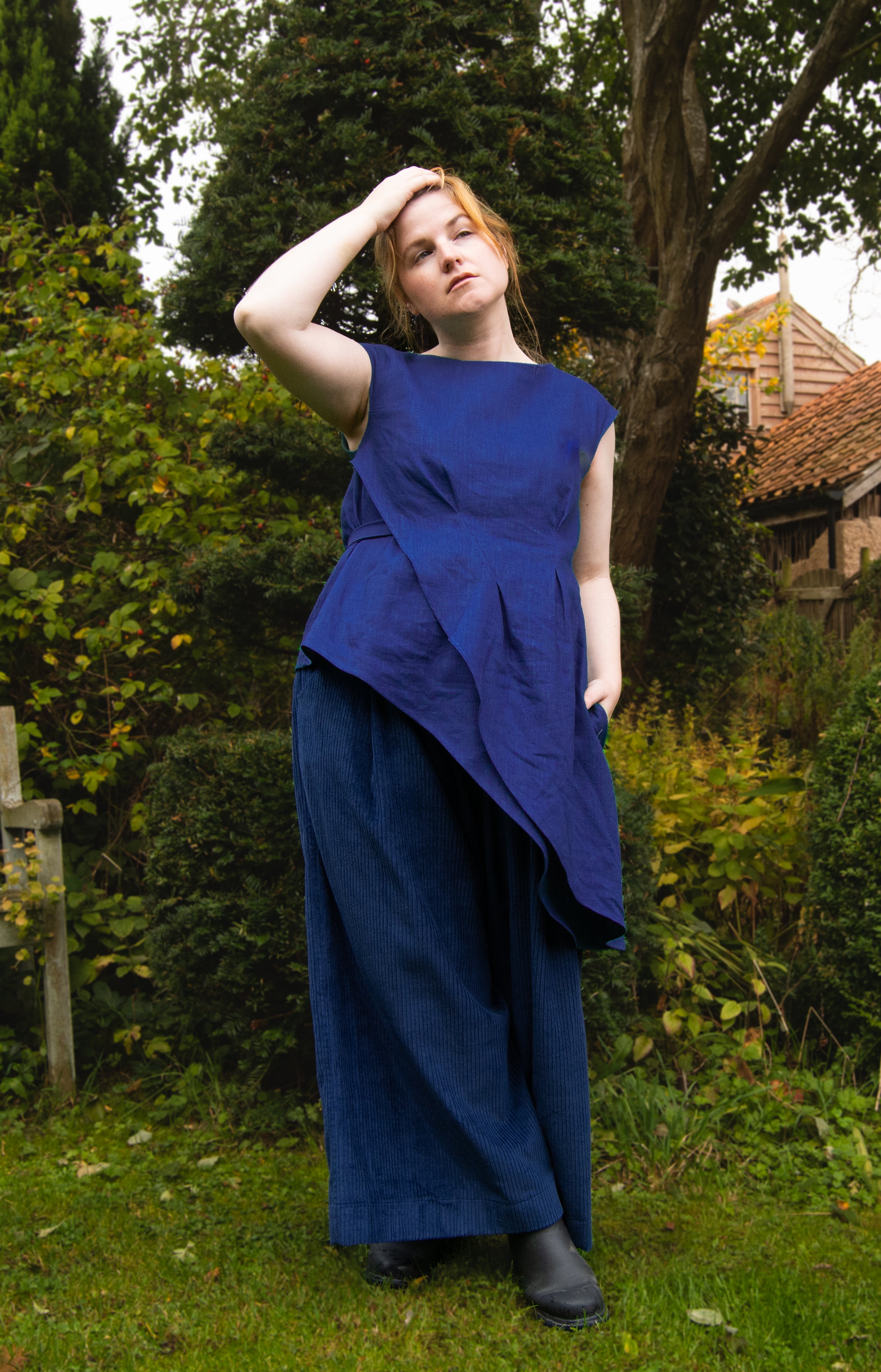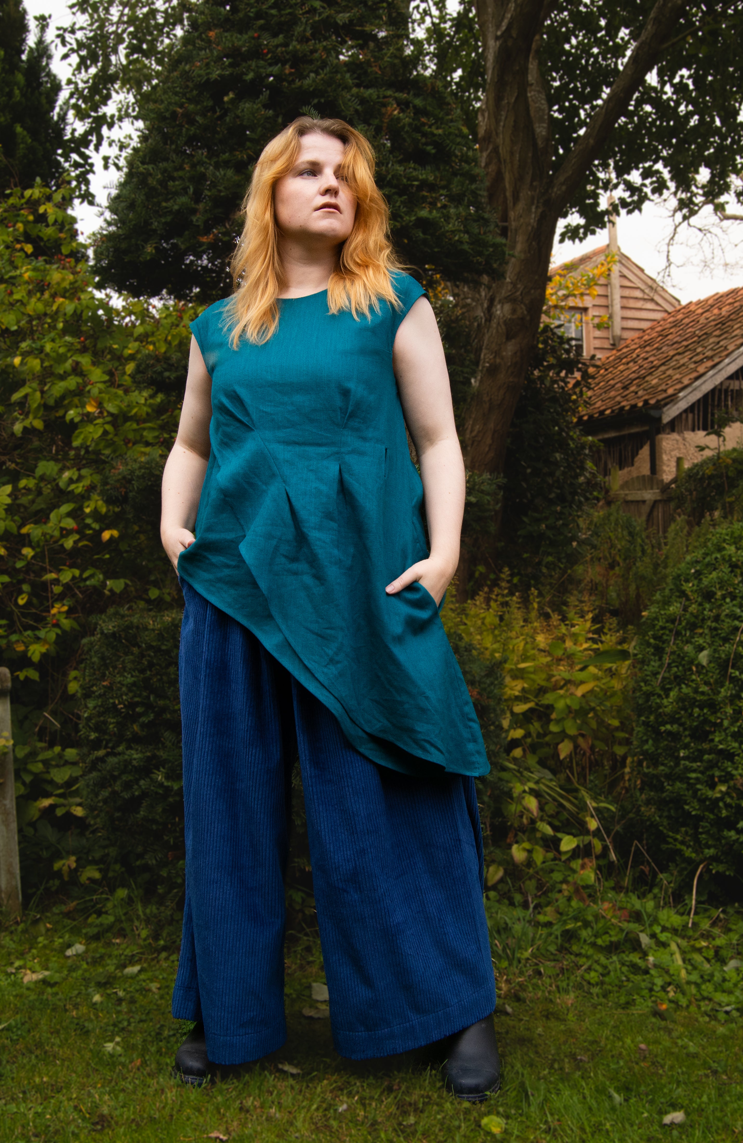 With a faux wrap at the front, shape is created with pleats on this area. The tie slips beneath though a hidden hole (only through the top layer) to wrap around the back without catching the wrap! You could also wear loose, or wrap the waist fully (see images).