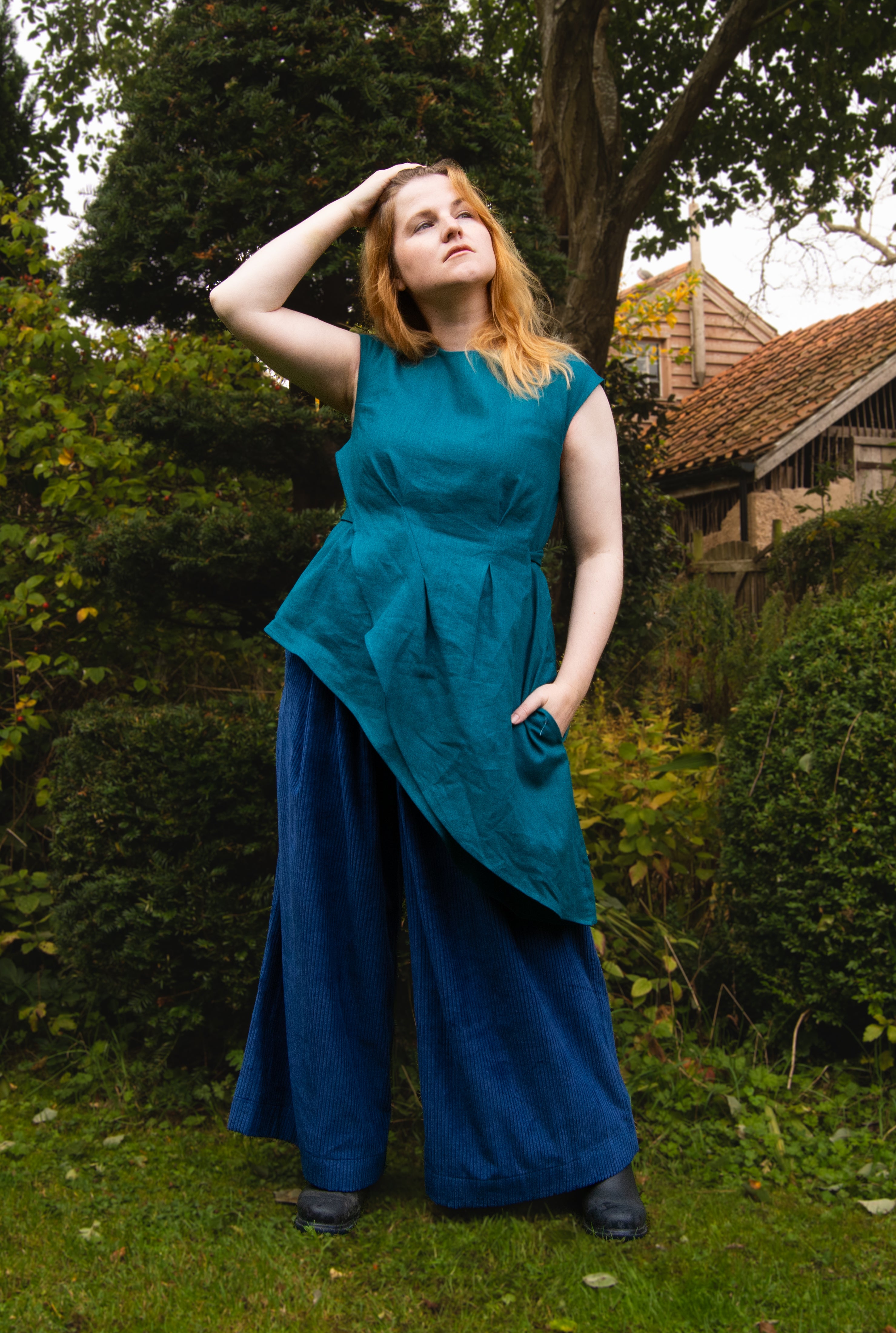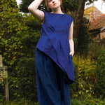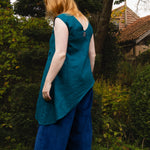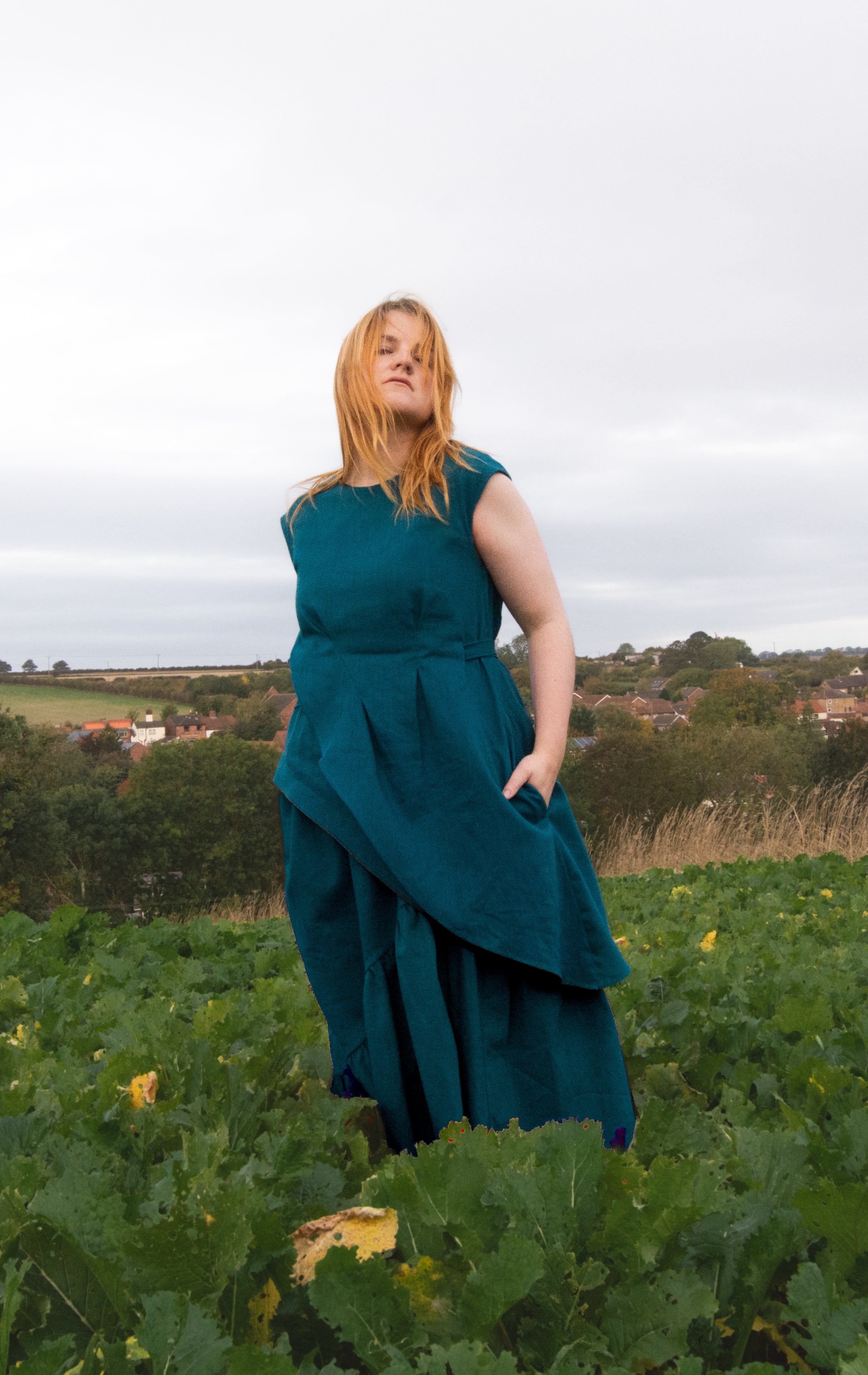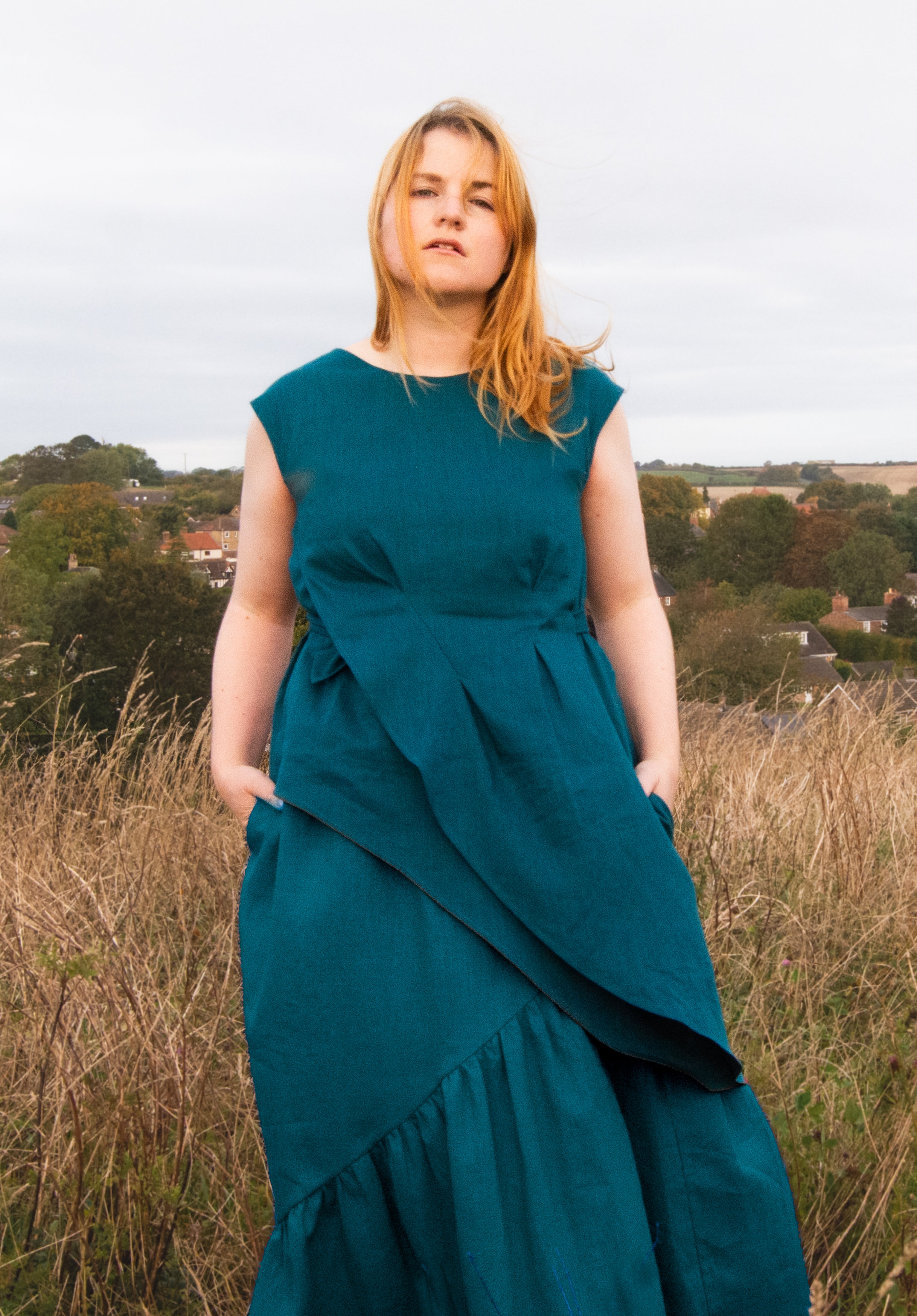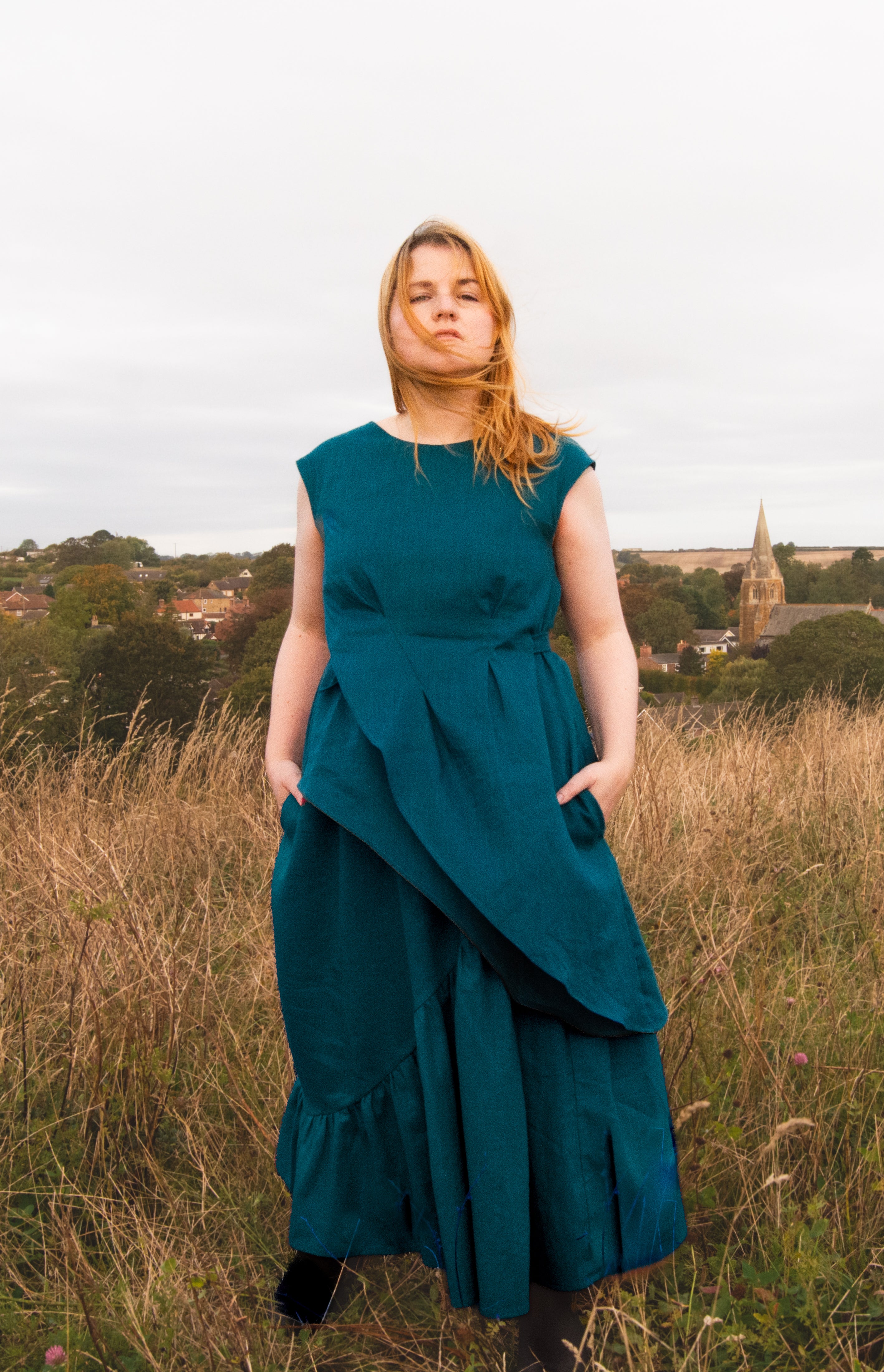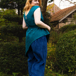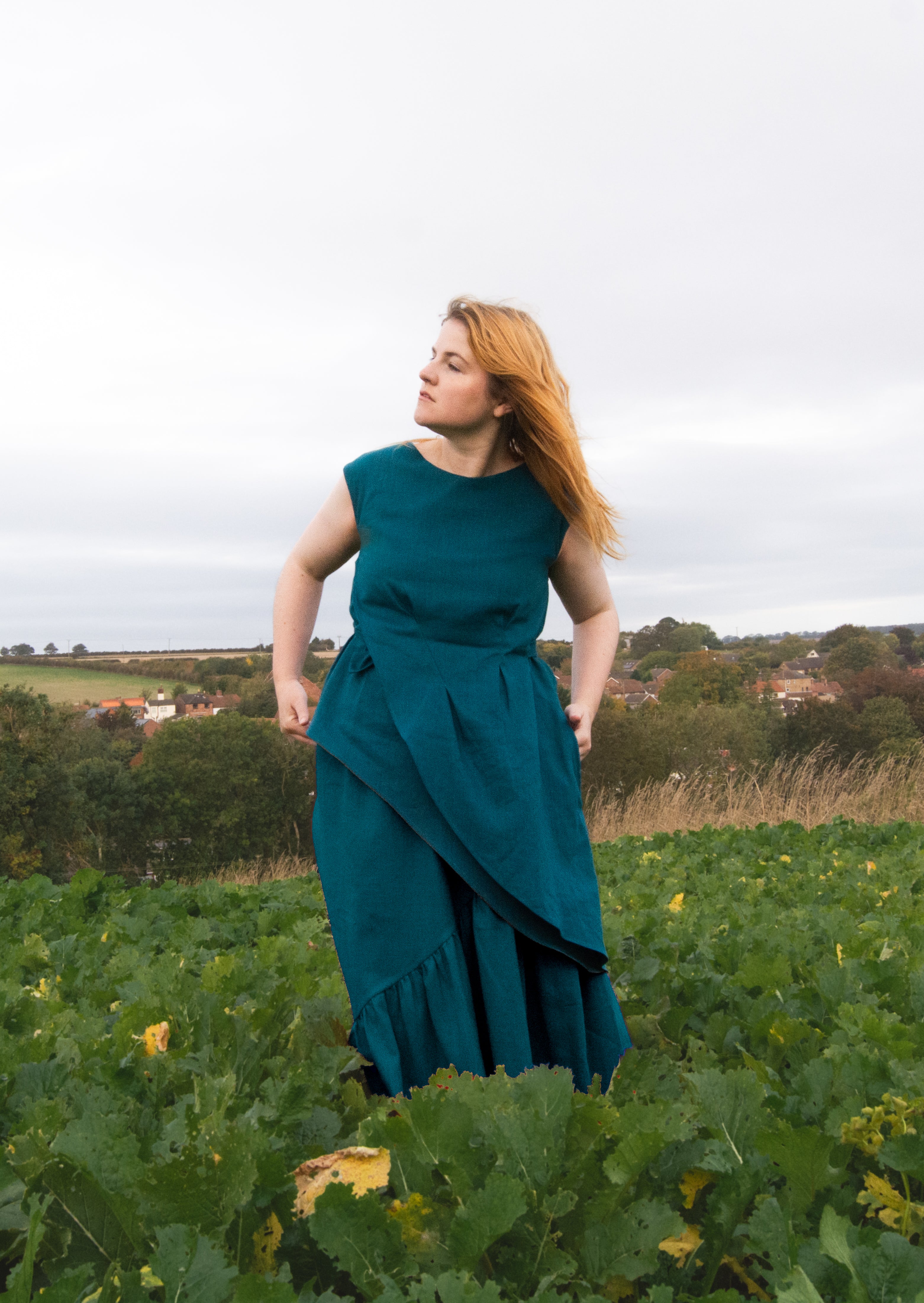 With a faux wrap at the front, shape is created with pleats on this area. The tie slips beneath though a hidden hole (only through the top layer) to wrap around the back without catching the wrap! You could also wear loose, or wrap the waist fully (see images).