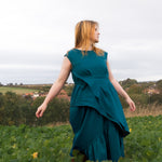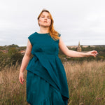 This unique design has a faux wrap at the front, with strategically placed pleats to drape across the body perfectly. It is nipped in with a tie hidden beneath the wrap - a true feat of engineering!