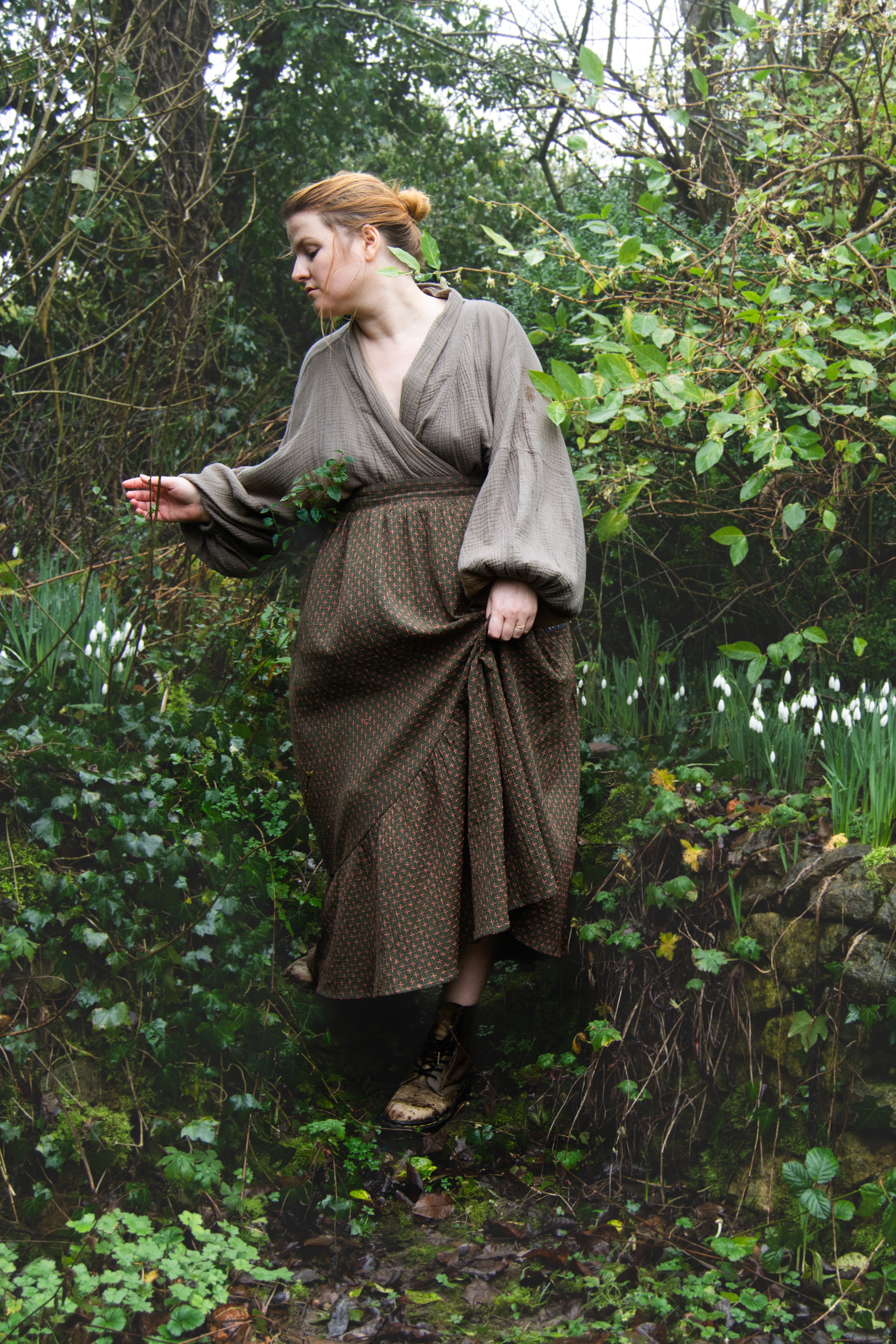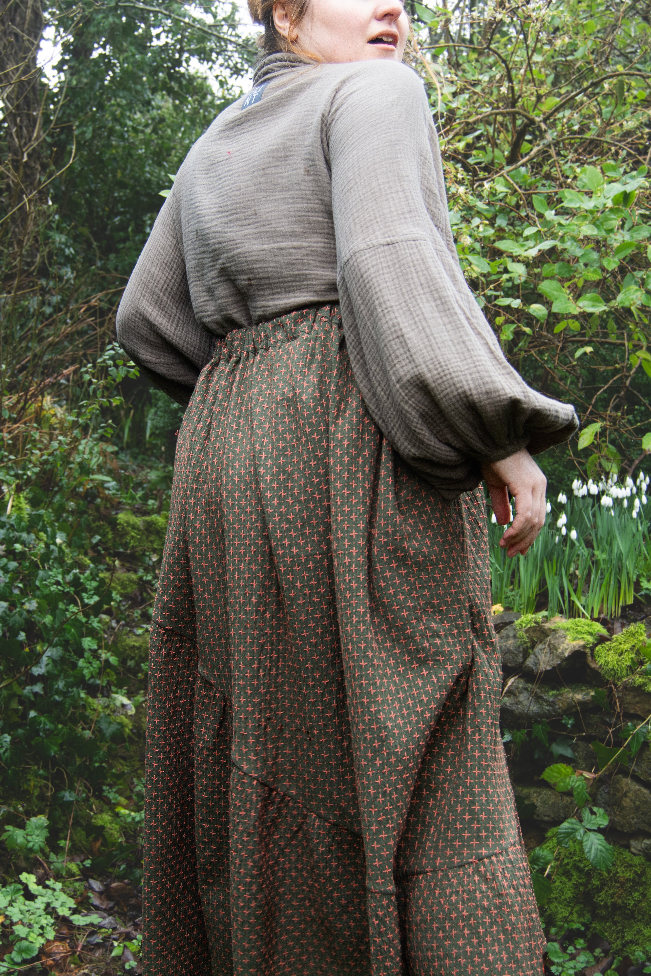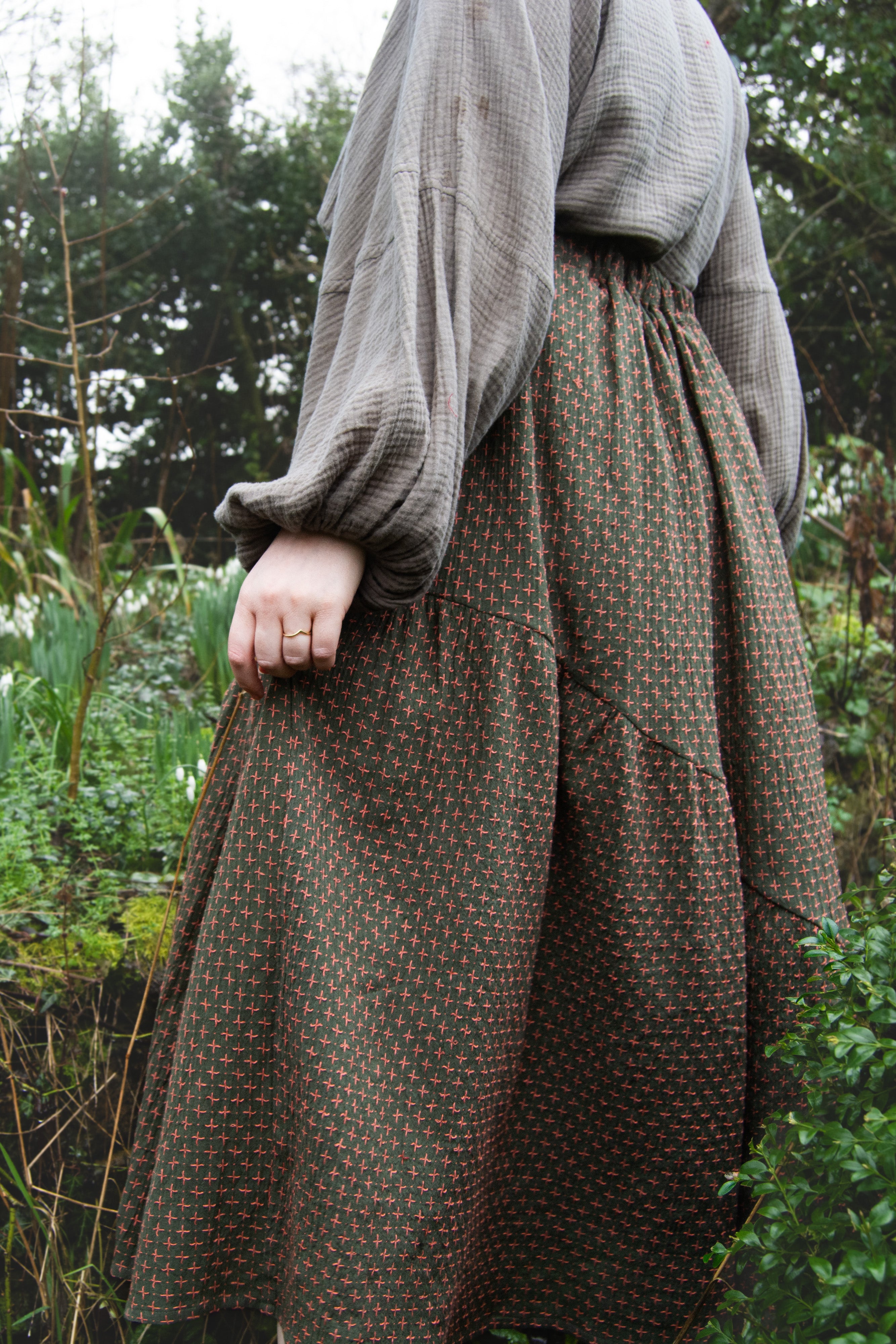 This fabric is a beautifully light cotton in olive green with an embroidered pink cross stitch pattern. The natural crinkle within the fabric means the gathers are slightly less pronounced, making this is the ultimate everyday piece, that still feels special.