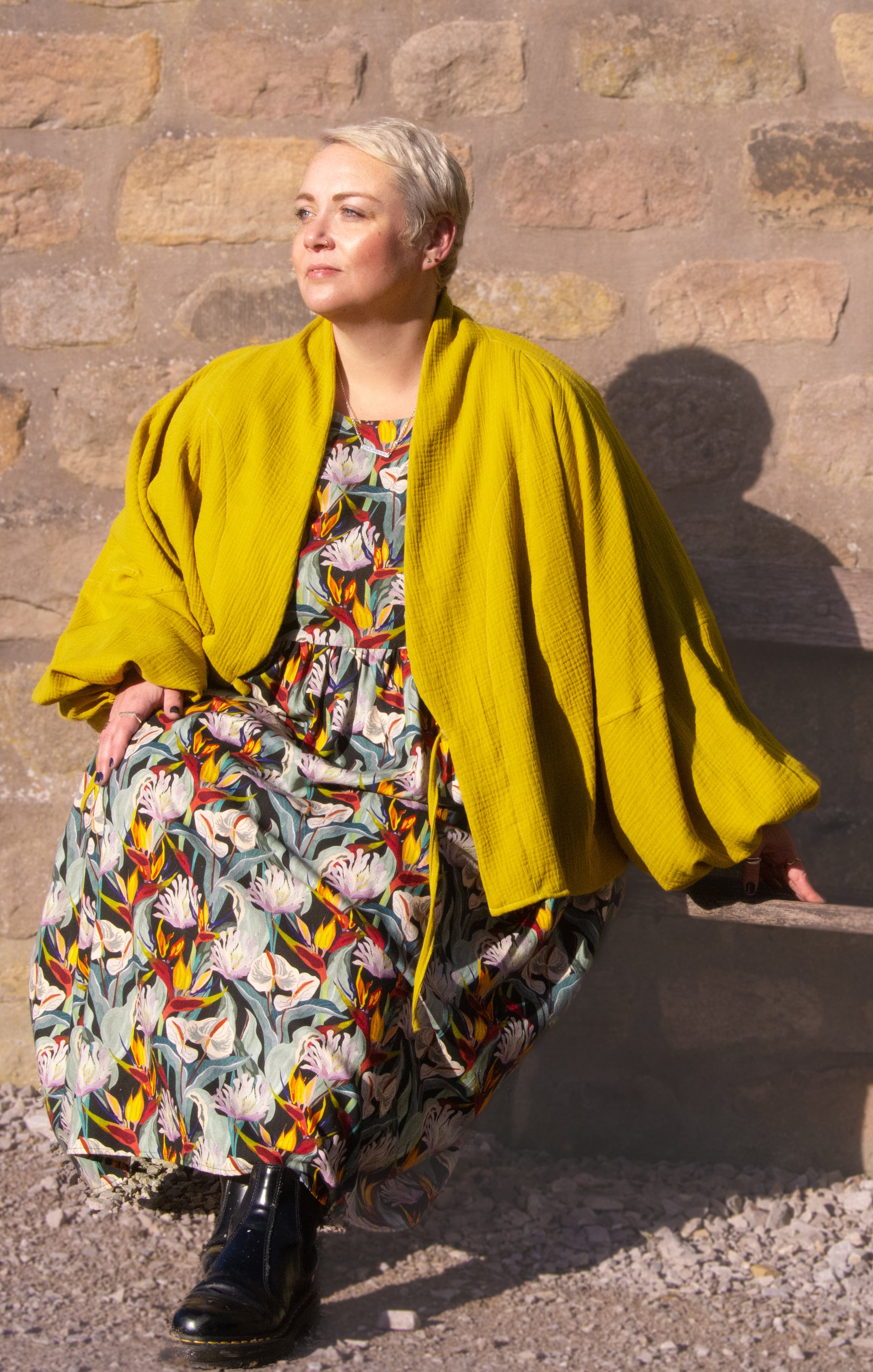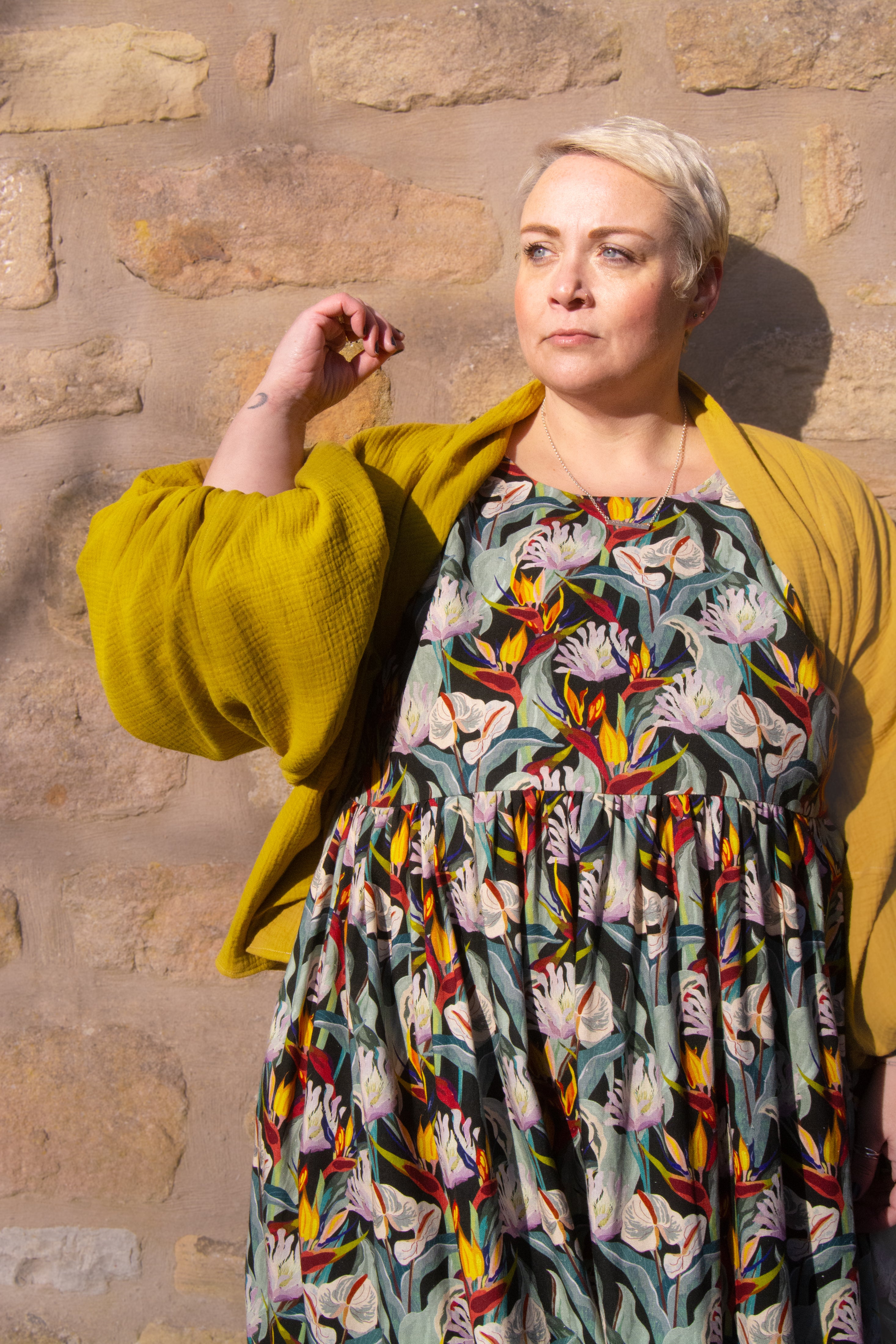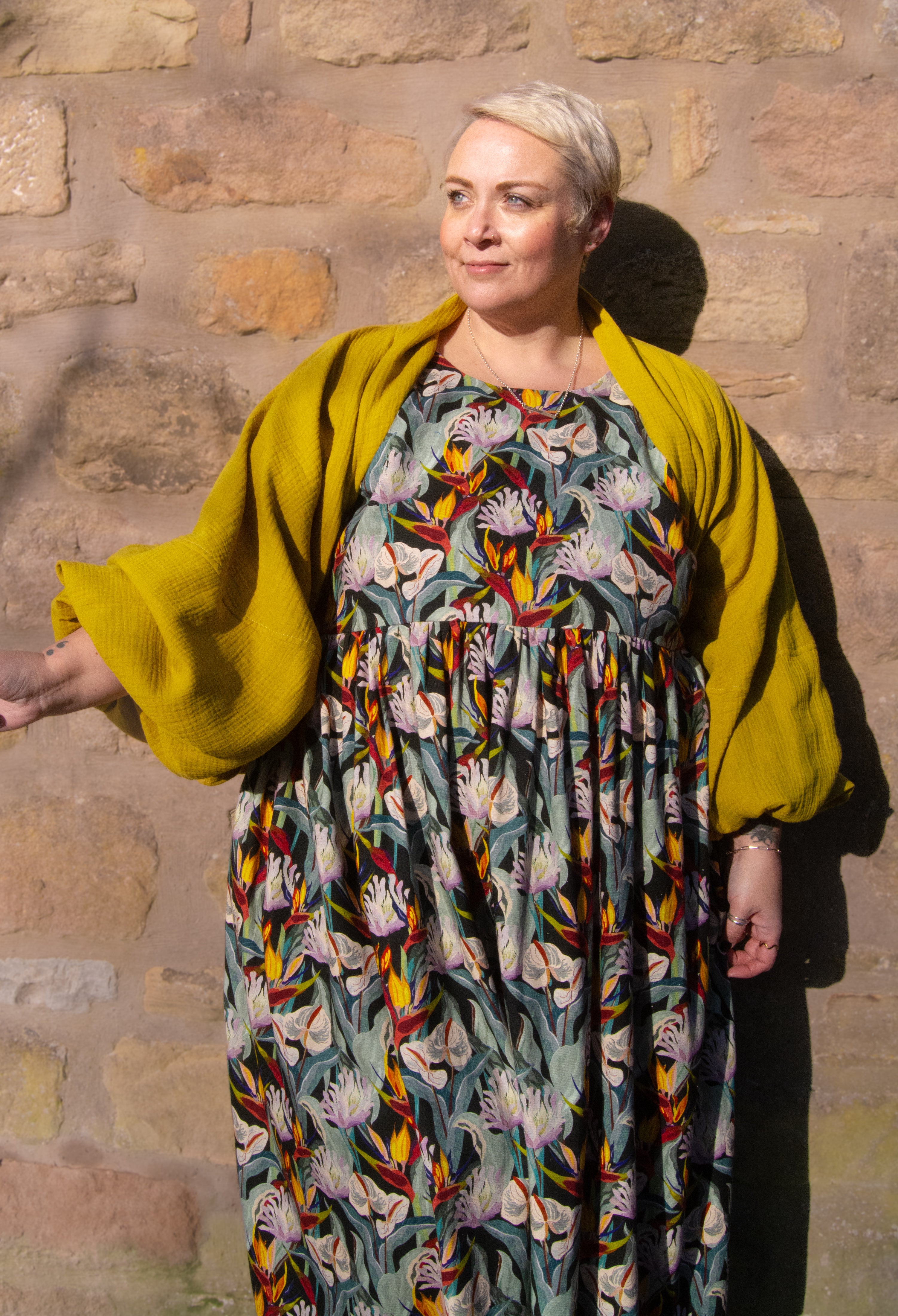 This version is made in a beautifully light 100% viscose, with a check and floral print. The green and yellow tones are punctuated by flashes of pink, resulting in a completely unique fabric that you can pair with so many other colours! The fabric is also fairly crease-resistant, so it is perfect to throw in a bag en-route to some summer sun.